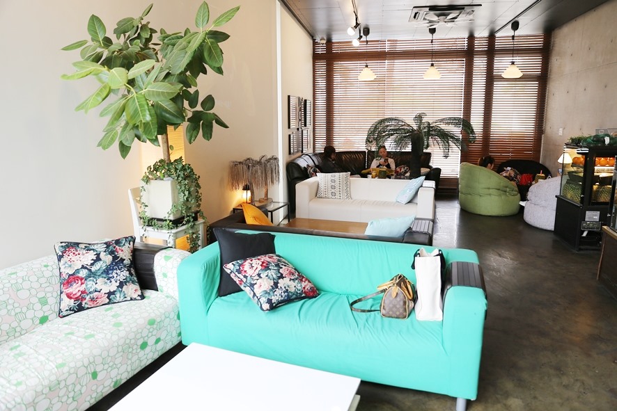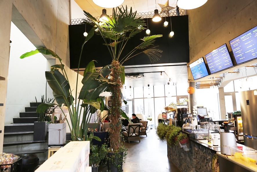 노 키즈 존의 안타까움을 뒤로 한 채 매장으로 들어갔는데요. 카페의 첫인상은 ‘차분하다’는 느낌을 받았답니다. 일주일간의 피곤함과 스트레스로 지친 몸을 힐링하기에 딱 좋은 분위기라고 할까요? 다양한 열대식물들이 카페 내부에 자리잡고 있어서 그런지 이국적인 분위기도 느낄 수 있어 마치 일상으로의 탈출이라는 컨셉과 너무 잘 어울렸어요.