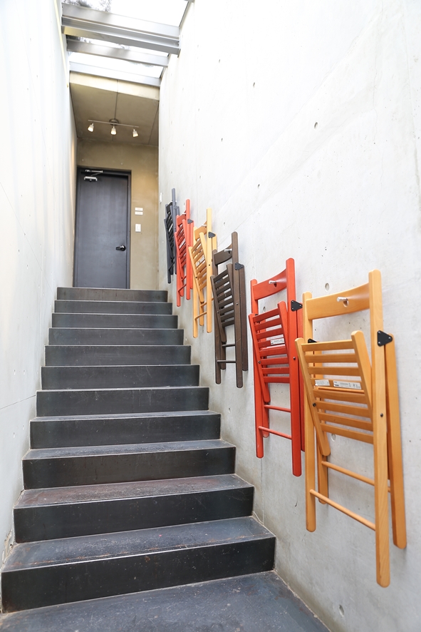 정원까지 둘러본 후 마지막으로 카페 아이사구아 2층으로 향했어요. 매장 안으로 다시 들어와 2층으로 향하는 계단을 딱 보는 순간 의자들이 벽걸이로 걸려있는 것을 발견했는데요. 이 의자들은 원래 야외 테라스와 정원에서 사용되는 의자들이지만 사용하지 않을 때에는 계단에 걸어 둔다고 해요. 보관은 물론 인테리어 아이템으로 활용하고 계신 모습을 보니 사장님의 센스도 엿보이고 집 인테리어를 꾸밀 때 정말 좋은 팁이 되어줄 것 같았어요^^