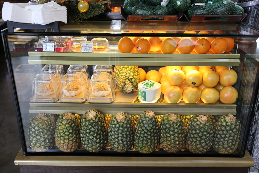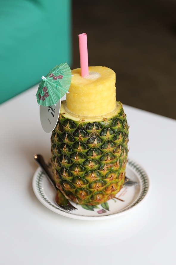 쇼케이스 안에 가득 담겨있는 파인애플만큼 이미 와 계시던 손님들의 테이블만 보아도 인기를 실감할 수 있는데요. 시그니처 음료인 파인애플 주스를 주문하지 않은 테이블이 없을 정도 였답니다. 그 뿐만 아니라 코코넛, 오렌지 등의 생과일도 함께 신선한 상태로 준비되어 있었어요.