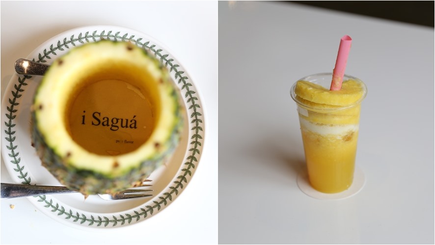 카페 아이사구아의 시그니처 음료인 파인애플 주스는 실물로 보면 정말 입이 떡 벌어질 정도의 비주얼을 보여주는데요. 파인애플 속을 다 파낸 다음 한 통을 그대로 주신답니다. 반은 주스 형태로 갈아서 제공해주고 반은 과일 형태로 제공해주시기 때문에 다른 느낌으로 즐길 수 있었어요.