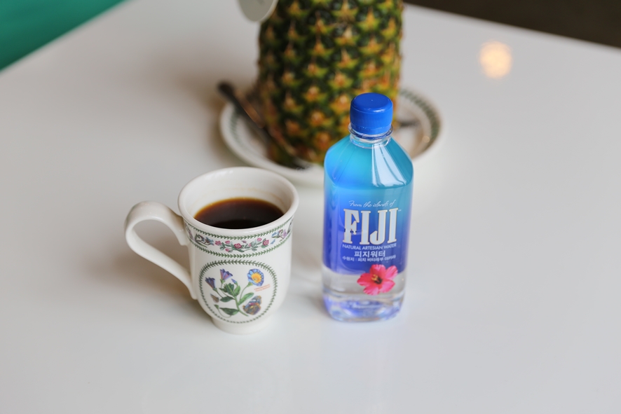 동동이가 주문한 이곳의 시그니처 메뉴, 파인애플 주스와 커피 그리고 간단하게 함께 먹을 수 있는 쿠키슈가 나왔는데요. 가격은 생각보다 약간 높게 형성되어 있지만 파인애플이 한통으로 나오고 커피 원두가 최상금 원두임을 감안함과 동시에 경치 값을 더한다면 괜찮은 가격이라고 생각이 들었답니다^^