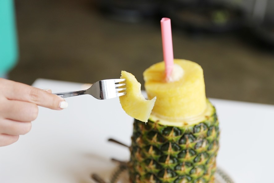 파인애플 한 통은 꽤나 많은 양이기 때문에 남기게 되는 상황이 발생하기도 하는데요. 하지만 걱정 없답니다! 파인애플 통 내부에 컵이 담겨 있기 때문에 자리에서 다 먹지 못하더라도 테이크아웃이 가능해요.