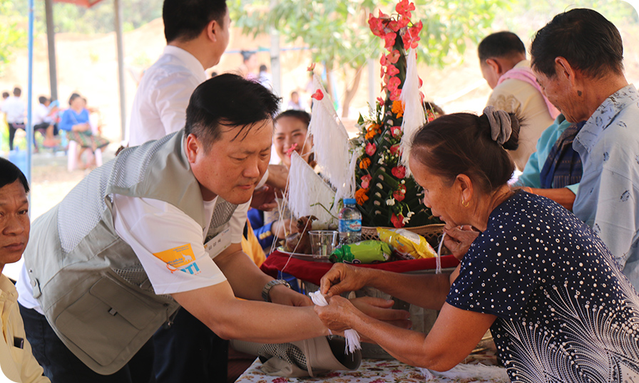 ▲라오스 전통 축원의식인 ‘바시’. 팔에 흰 실을 묶어 모두의 안녕을 빈다. 왼쪽은 DB손해보험 김강욱 베트남법인장