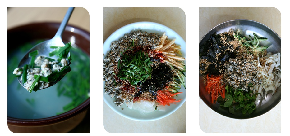 ▲섬진강 근처에서 맛볼 수 있는 재첩국과 재첩무침, 재첩비빔밥