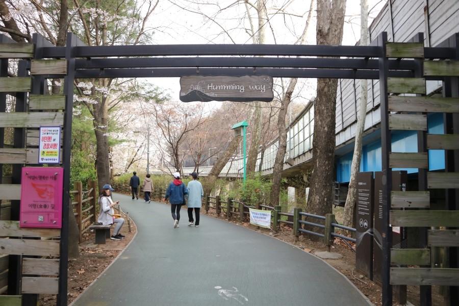 이렇게 동작역 1번 출구에서 나와 허밍웨이 길을 쭉 걸으며 꽃을 감상하다 보면 10분~15분 이내로 끝 지점에 다다를 수 있는데요. 이 때 끝나는 출구로 아예 나가기 보다는 바로 직전 양갈래길에서 아랫쪽으로 내려가는 것이 계속해서 산책길을 이어갈 수 있어 더 좋은 것 같아요.