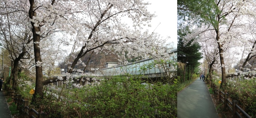 교각을 통해 피천득산책길로 진입했는데요. 햇빛을 잘 받는 쪽이 벚꽃 개화가 더 빠르기 때문에 벚꽃이 거의 90% 정도 개화되어 있었답니다. 이 때문에 반포천 벚꽃길보다는 인증사진을 찍는 사람들이 더 많이 보였어요.