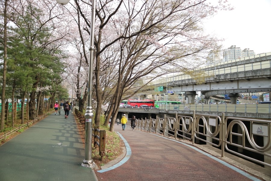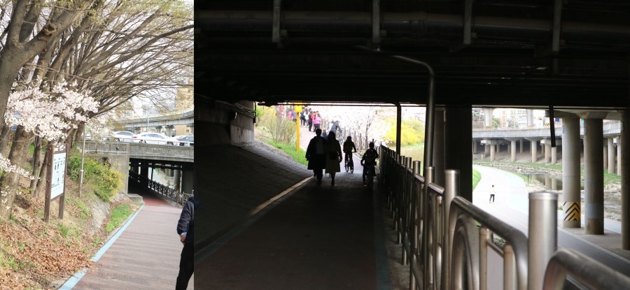 벚꽃놀이를 가게 되면 정말 다양한 각도로 인증샷이 쏟아져 나오게 되는데요. 주로 세로로 벚꽃길 전체를 담거나, 하늘 위로 렌즈를 올려 하늘의 벚꽃을 찍기도 하는데요. 특히 반포천 산책로의 경우 벚꽃놀이 시즌이 아니라도 도로가 잘 포장되어 있어 평소에도 조깅을 하거나 자전거를 타러 나오기에도 안성맞춤이랍니다. 이렇게 한 다리만 아래로 내려가도 주민 분들이 유유자적 운동을 즐기고 있는 것을 볼 수 있는데요. 동동이도 벚꽃 시즌이 지나면 한번 더 가서 자전거를 즐기고 오려고 생각중이랍니다.