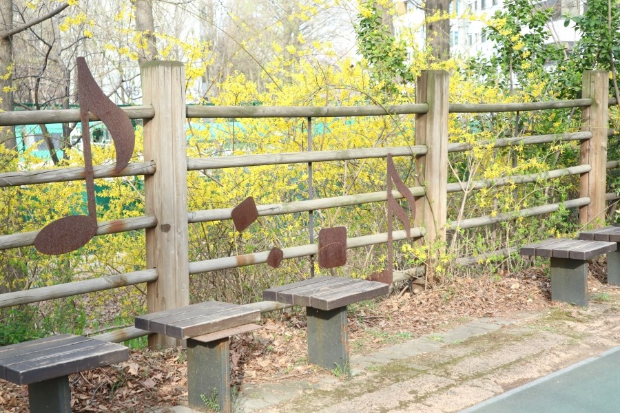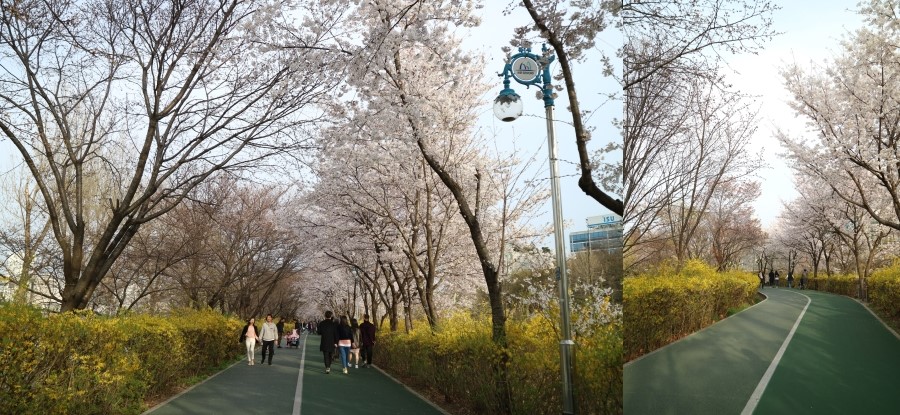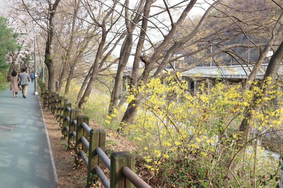 사실 동동이는 벚꽃보다는 개나리 꽃이 피어났을 떄 봄이 왔음을 느끼는데요! 벚꽃이 초록색 봉우리를 틔울 때 개나리가 먼저 노랗게 피어나면서 봄을 알려주더라구요. 반포천 산책로에서도 먼저 피어난 개나리들을 한눈에 볼 수 있는데요. 중간 중간 앉았다 갈 수 있는 의자들도 있어서 벚꽃나무와 함께 조금 더 다채로운 풍경을 눈에 담을 수 있답니다.