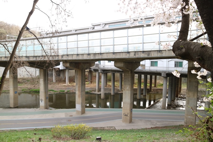 허밍웨이길 출구를 나가면 이렇게 대로변이 나오게 되는데요. 횡단보도를 건너 들어가면 피천득산책로로 이어진답니다. 하지만 피천득산책로길로 들어가게 되면 벚꽃 나무가 한 다리 아래에 위치해 있기 때문에 가까이서 벚꽃을 구경하기가 어려운데요. 동동이처럼 이렇게 허밍웨이길 출구 직전 양갈래길에서 아랫쪽으로 내려가 교각을 지나가는 것을 추천드린답니다. 이렇게 내려가면 반포천 산책길을 끊이지 않고 걸을 수 있고 무엇보다 횡단보도를 건너지 않고 구경이 가능해지죠.