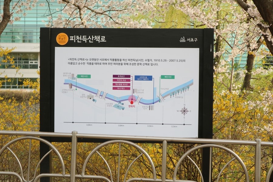 반포천 벚꽃길 산책로를 쭉 걷다보면 허밍웨이길을 지나 피천득산책로로 이어지게 되는데요. 동작역-신반포역-구반포역-고속터미널, 이렇게 지하철 역 4개 구간을 잇는 직선 거리랍니다. 천천히 걷는 걸음으로는 한시간 정도면 힘들지 않게 산책을 즐길 수 있는데요. 혹시나 걷다가 힘이 드신다면 신반포역, 구반포역까지 걷고 지하철을 이용하는 것도 방법이겠죠? ^^