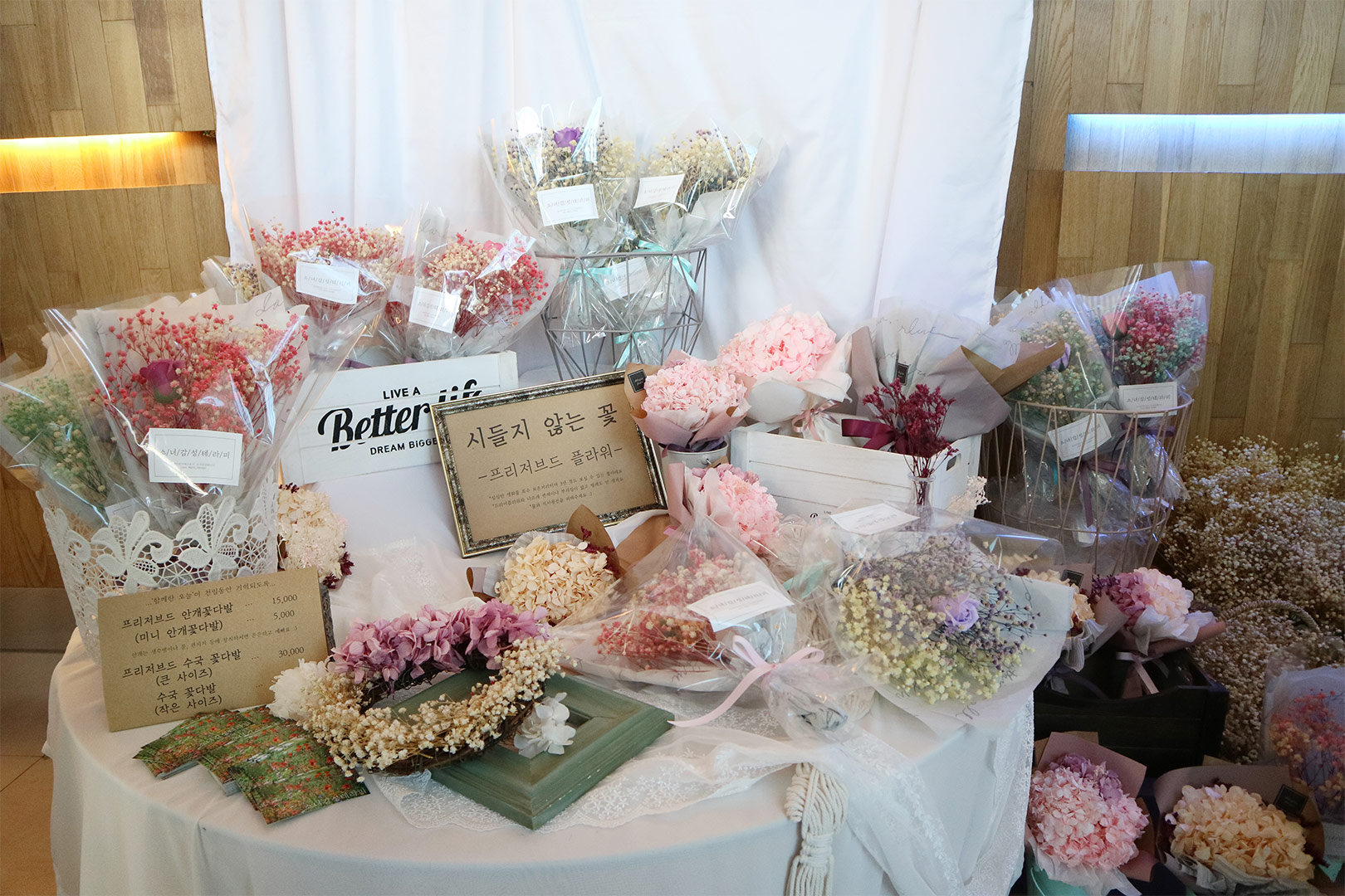 전시회 내용을 담은 다양한 굿즈들은 따로 준비되어 있지는 않았는데요. 대신 관람을 마치고 나오면 시들지 않는 꽃, 드라위 플라워를 구매할 수 있더라구요~
