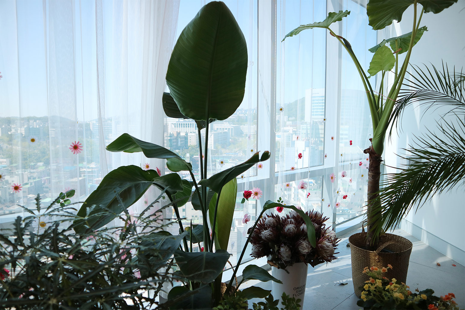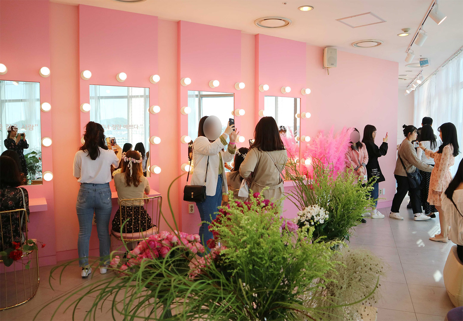바로 뒷 편으로는 생화가 잔뜩 장식되어 있어서 거울에 비치는 배경도 허전하지 않게 배치되어 있어요. 유리창에도 깨알같이 꽃이 매달려 있는 매쉬 소재의 커튼이라 또 다른 포토존으로 활용이 가능했답니다^^