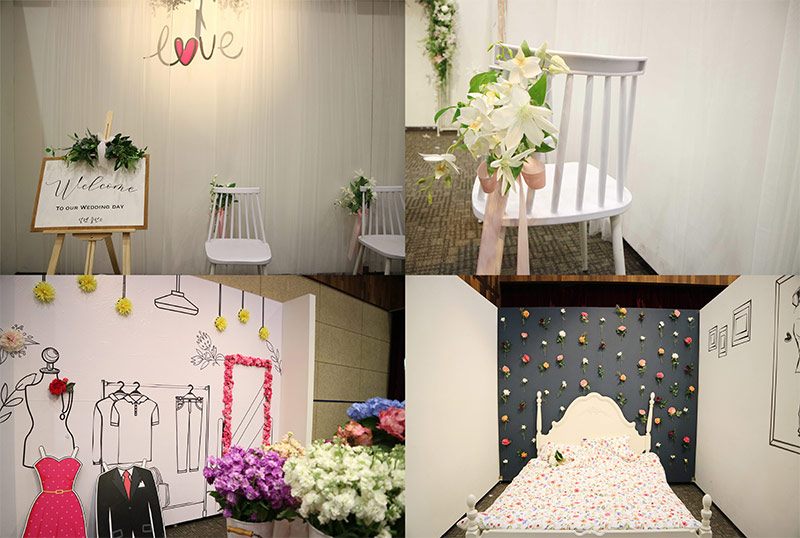 설렘충전소는 공간과 공간이 이어져있는 구성으로 전시가 준비되었는데요. 아마 눈치채신 분들도 계시겠지만, 설렘충전소는 입구부터 출구까지 사랑, 고백, 영원의 설레임이라는 테마가 표현되어 있어요. 떨리는 첫 데이트부터 시작된 달콤한 연애 그리고 프로포즈, 이어지는 행복한 신혼생활까지의 모든 과정을 꽃과 함께 조성해두었다는 것이 특징이에요. 설명을 듣고 보니 위에 보이는 사진은 신혼집인 것 같죠? 사진을 찍기 위한 전시회인 만큼 활용할 수 있는 다양한 소품을 준비둔 섬세함도 마음껏 누릴 수 있었습니다^^