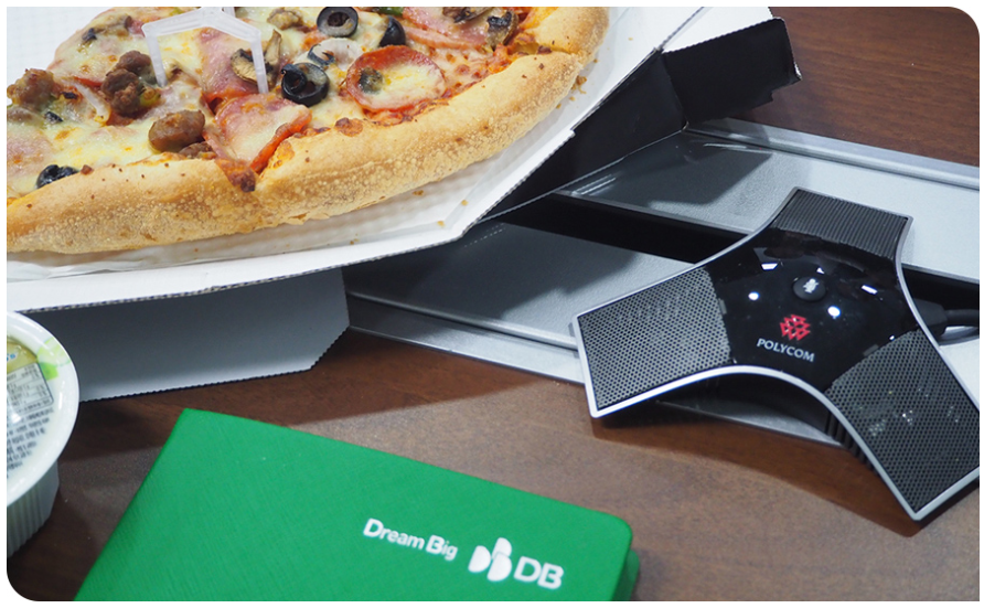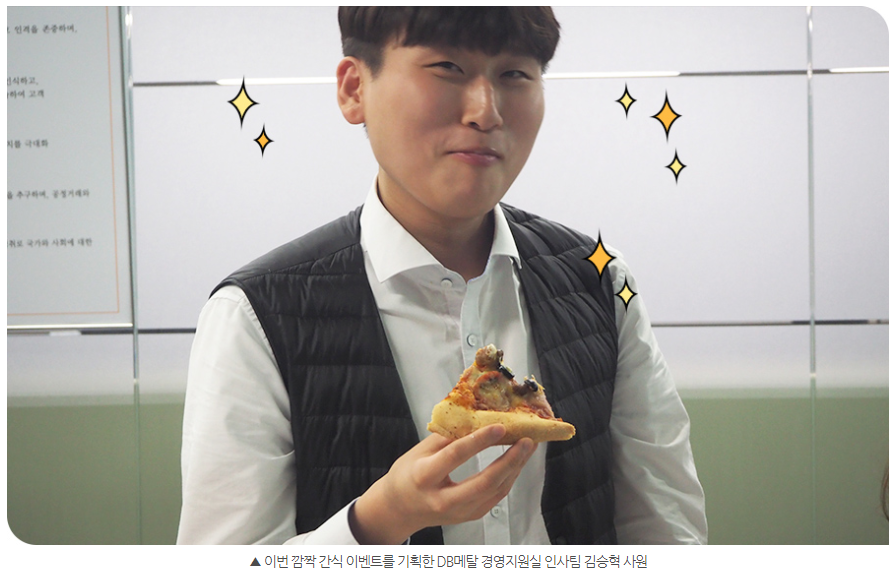 매달 진행되는 DB메탈 경영지원실 전체 회의의 진짜 목적은 ‘서로 간의 소통’이다. 고소한 냄새 폴폴 풍기는 피자 이벤트로 4월의 마지막 주 월요일을 활기차게 연 DB메탈 경영지원실의 모든 팀원들에게 배달의 DB가 열렬한 응원을 보낸다~! 파이팅!