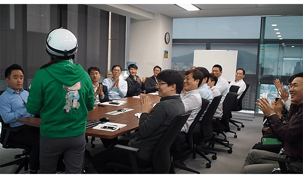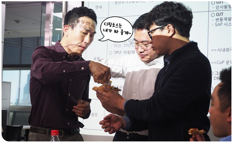 신입사원의 재기발랄한 이벤트는 제대로 성공했다. 바쁜 업무 중에 주어진 선물과 휴식은 모두에게 특별한 즐거움을 선사했다. 전략기획팀의 임성민 과장이 피자를 한입 가득 베어물고 말했다. “어려운 시기를 함께 극복해 오면서 경영지원실 전체 팀원들은 끈끈한 동료애가 있어요. 특히 이 회의가 구심점 역할을 하고 있죠. 전체 회의를 진행하지 않았을 때보다 업무가 체계적으로 진행되고, 효율도 높아졌거든요. 종종 점심이나 저녁을 다 같이 먹기는 하는데, 이렇게 업무 중간에 간식 타임은 처음이에요(웃음).”