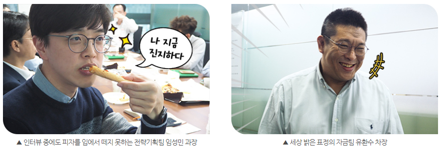상사들의 반응도 뜨겁다. 오늘의 서프라이즈 간식 타임을 전혀 예상하지 못했다는 자금팀의 유환수 차장은 “기회가 된다면 종종 이런 시간을 가져도 좋을 것 같다.”며 운을 뗐다. “회의 자체가 ‘보고’라기보다는 각자의 업무를 공유하고 파악하는데 중점을 둔 터라 분위기가 크게 딱딱하지는 않은데, 아무래도 업무 얘기가 주제다 보니 다소 밋밋하고 건조할 수 있거든요. 그런데 이런 이벤트가 있으니까 분위기가 굉장히 좋네요. 재미있어요(웃음).”