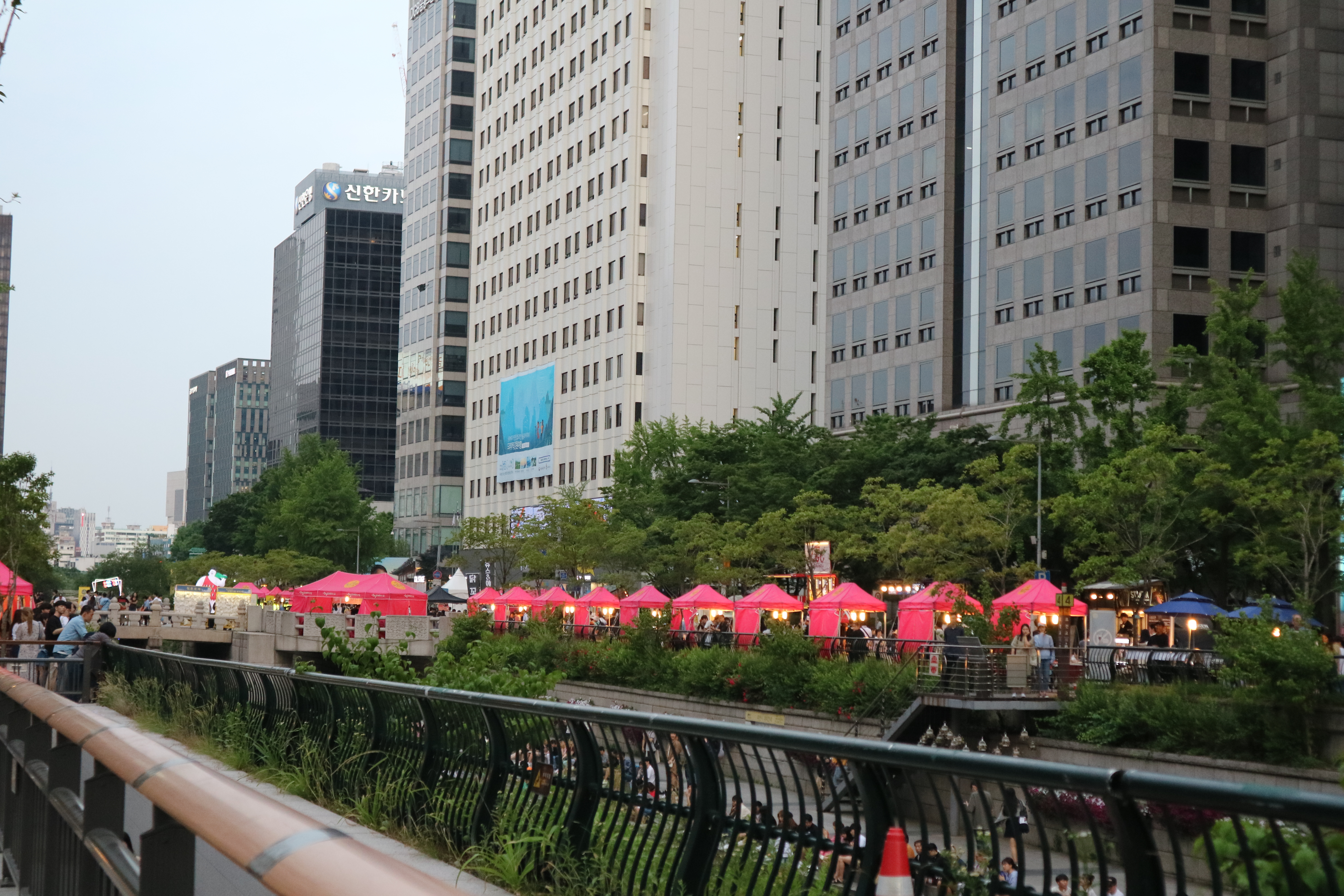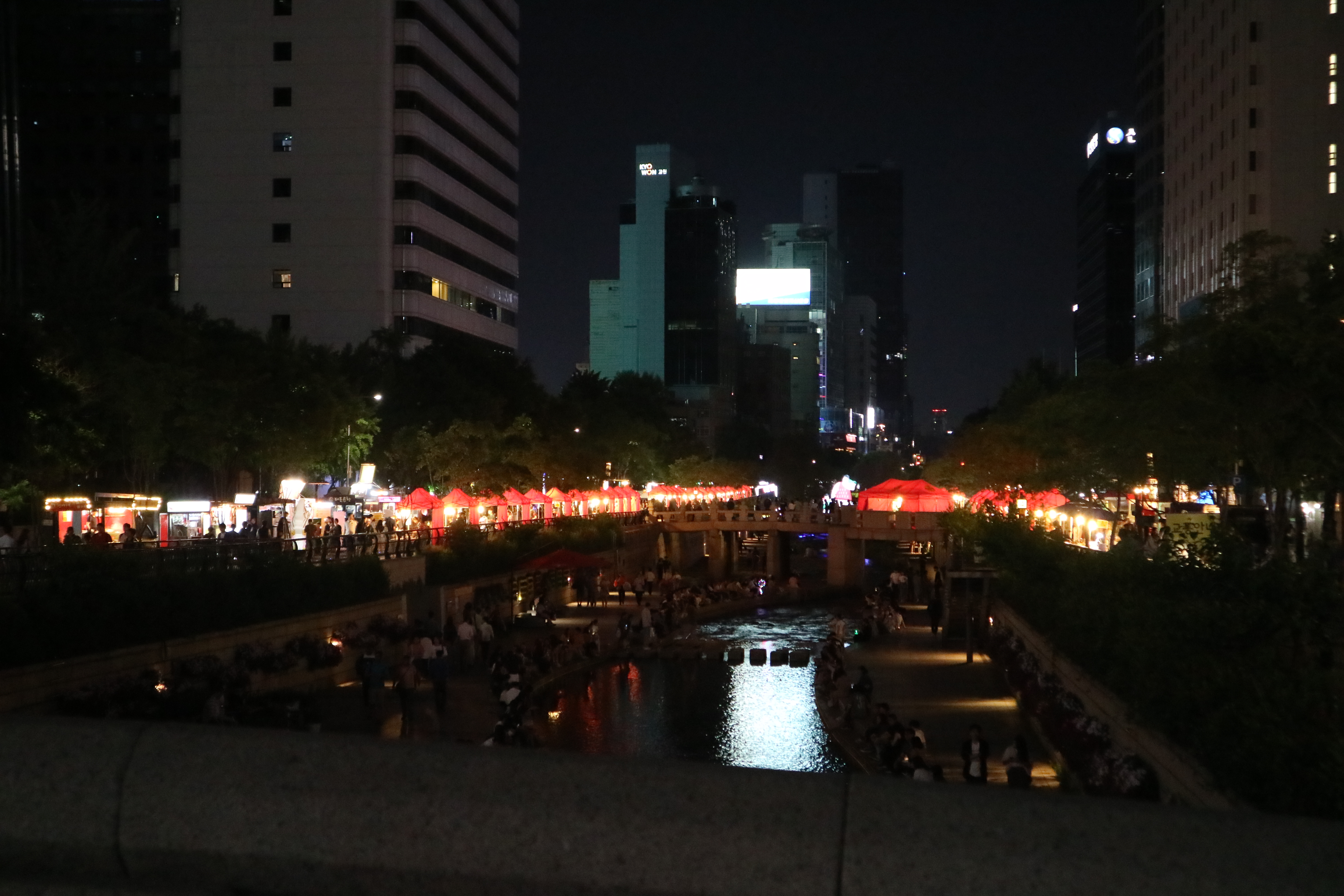 2시간 정도 신나게 놀고 나니 어두워진 청계천 밤거리, 붉은 텐트들이 멀리서 보니 또 하나의 예쁜 야경이 되었네요 :-) 매년 이맘때쯤 열리는 연중행사로 자리 잡은 밤도깨비 야시장은 이제 안 가면 섭섭한 곳이 된 것 같아요. 청계천이 아니더라도 DDP, 여의도, 반포에서도 열리고 있으니까 한 번씩 들러보는 것도 재미있겠죠?