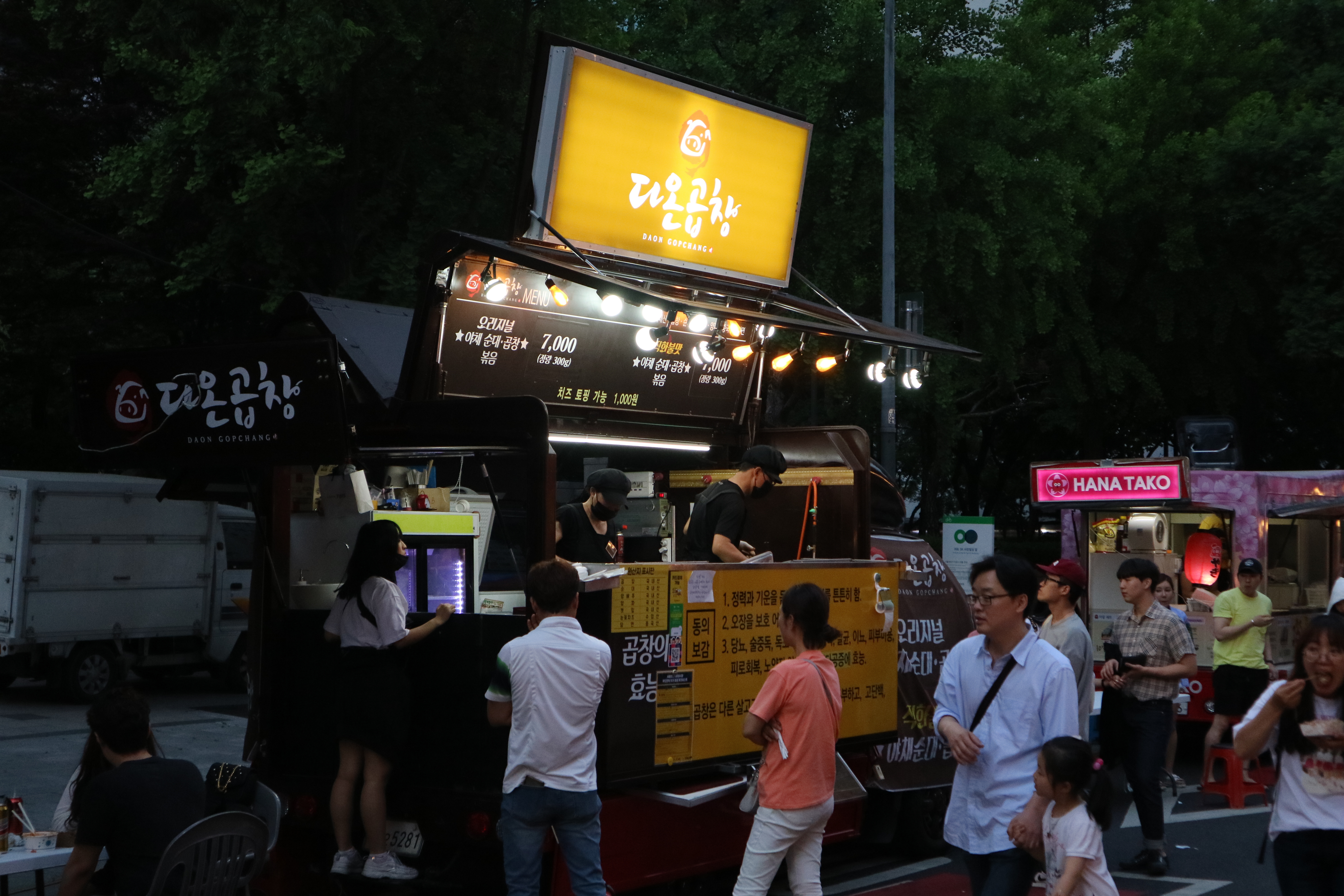 대부분의 사람들이 ‘밤도깨비 야시장’을 찾는 이유는 바로 먹거리, 푸드트럭이겠죠? 청계천 밤도깨비 야시장에는 흔히 볼 수 있는 길거리 음식인 닭강정, 꼬치를 포함해 시원한 커피, 주스, 그리고 야시장에서 절대 빠질 수 없는 즉석구이 음식들로 가득했어요! 평소에 본 적 없는 곱창트럭과 스시트럭도 있었는데 맛이 좋은지 줄이 엄청나더라구요!
