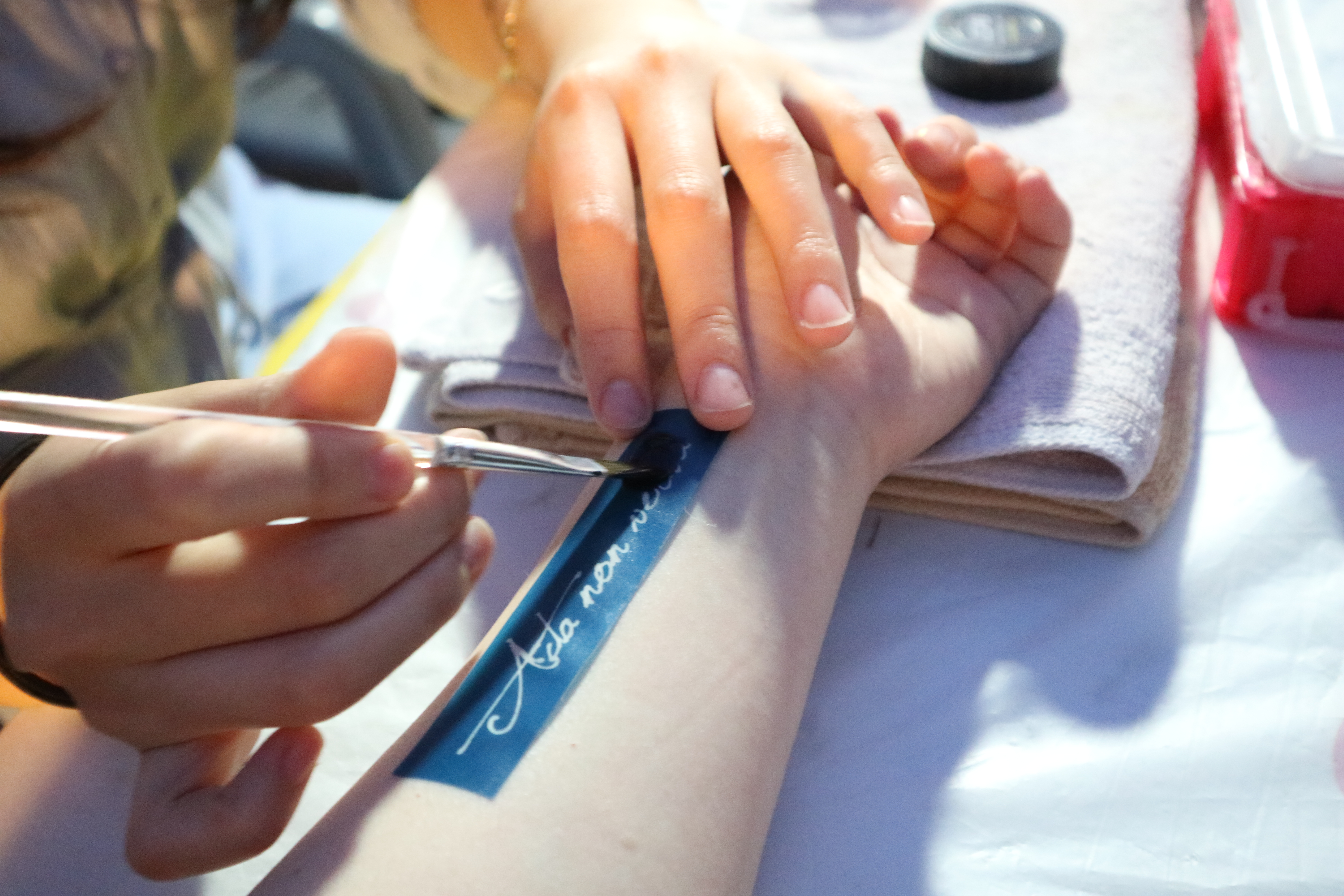 헤나는 영구적이지 않고 한 1주일 정도만 유지되어 물감만 칠하면 되기 때문에 1분 밖에 걸리지 않아요. 스탠실의 사이즈에 따라 5,000원에서 15,000원까지 다양한 도안이 준비되어 있었는데요! 동동이는 여자들에게 인기 있는 레터링 문구를 골라보았어요! 모양이 이뻐서 많이들 한다는 요 타투는 ‘말보단 행동으로’라는 뜻이라고 해요. 평생 지워지지 않는 부담이 없기 때문에 짧은 옷을 많이 입게 되는 여름에 간단하게 하나 그리기 좋은 것 같아요.
