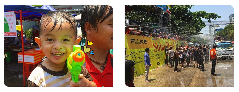 미얀마 여행의 백미는 동남아시아 물축제 Best 5 안에 드는 미얀마 ‘띤잔(Thingyan) 축제’다. ‘띤잔’은 미얀마 최대의 명절로, ‘바꾸다’라는 의미를 가진다. 매년 4월 중순에 깨끗함을 상징하는 물로 악업은 씻어내어 정화하고, 복을 기원해준다는 의미로, 처음 만난 사람에게도 서로 물을 한가득 부어주는 축제(띤잔 축제)가 열린다. 흔히 ‘물총 싸움’으로 유명한 태국 송크란 축제의 모티브가 된 것이 바로 이 ‘띤잔 축제’다. 다른 나라의 물축제보다 통제가 잘 되는 편이라 어린이들도 마음 놓고 즐길 수 있을 정도로 유쾌하다. 덕분에(?) 갑자기 튀어 나와 물을 붓는 어린 아이들이 가장 큰 축제의 복병이다. 복을 염원하면서 서로 물을 부어주고, 신명나게 축제를 즐기는 사람들을 보면서 우리의 흥도 절정에 달했다.