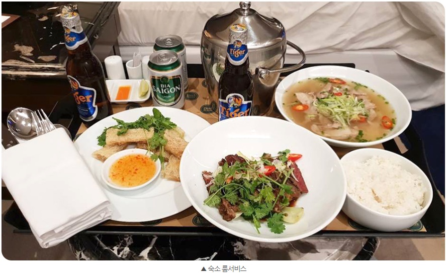 베트남을 다녀온, 거의 모든 사람들이 추천한 이동 수단인 Grab(카카오택시와 비슷한 택시 앱)을 이용해 숙소로 향했다. 도착하자마자 쌀국수를 룸서비스로 시켰다. 아마 다른 여행지였다면 비싼 가격 때문에 호텔 룸서비스는 생각지도 못 했을 것이다. 하지만 이곳 다낭에서는 잠시 호화로움을 누려도 좋을 만큼 물가가 정말 착하다. 우리는 호텔에 가면 의례 룸서비스를 시키는 사람들처럼 여유있게 쌀국수를 즐겼다(강한 고수의 향 때문에 정작 많이 먹지 못한 건 작은 비밀이다).