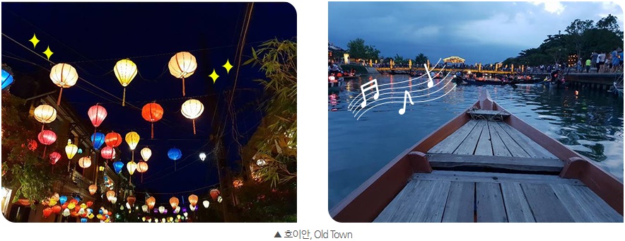 호이안의 올드타운은 옛날 마을의 형태를 그대로 유지하고 있어 볼거리가 넘친다. 가는 길목마다 기념품 가게와 길거리 음식이 있다. 저녁이면 곳곳에 매달려 빛을 벗하는 등도 운치를 더했다. 강가에서 배를 타고 소원등을 물에 띄우는 체험도 가능하다. 우리는 둥실둥실 배를 타고 강 양옆으로 늘어선 마을을 구경하며 소원도 빌었다(배 체험 비용은 흥정이 가능하니 부르는 대로 지불하지 말 것!).