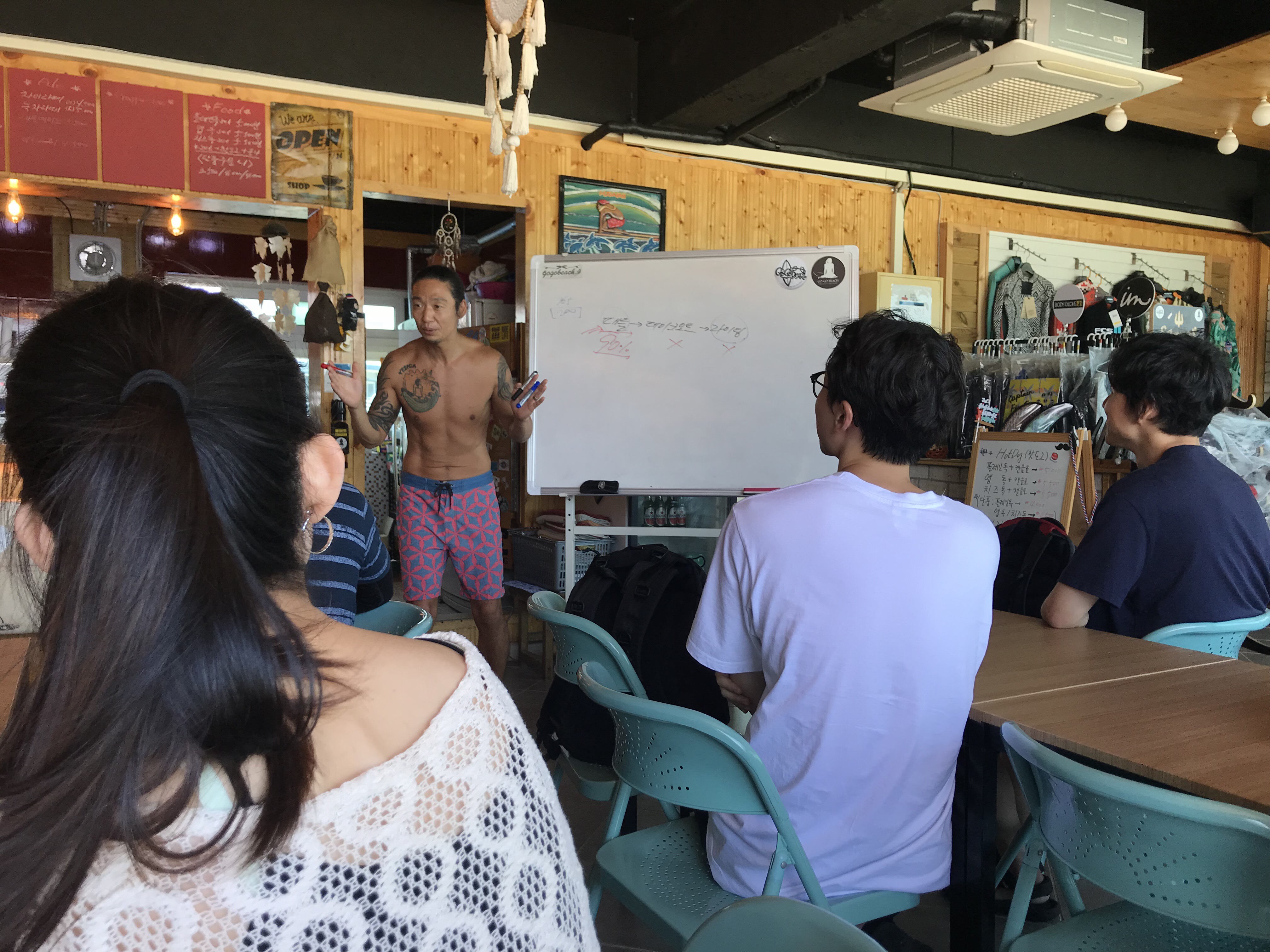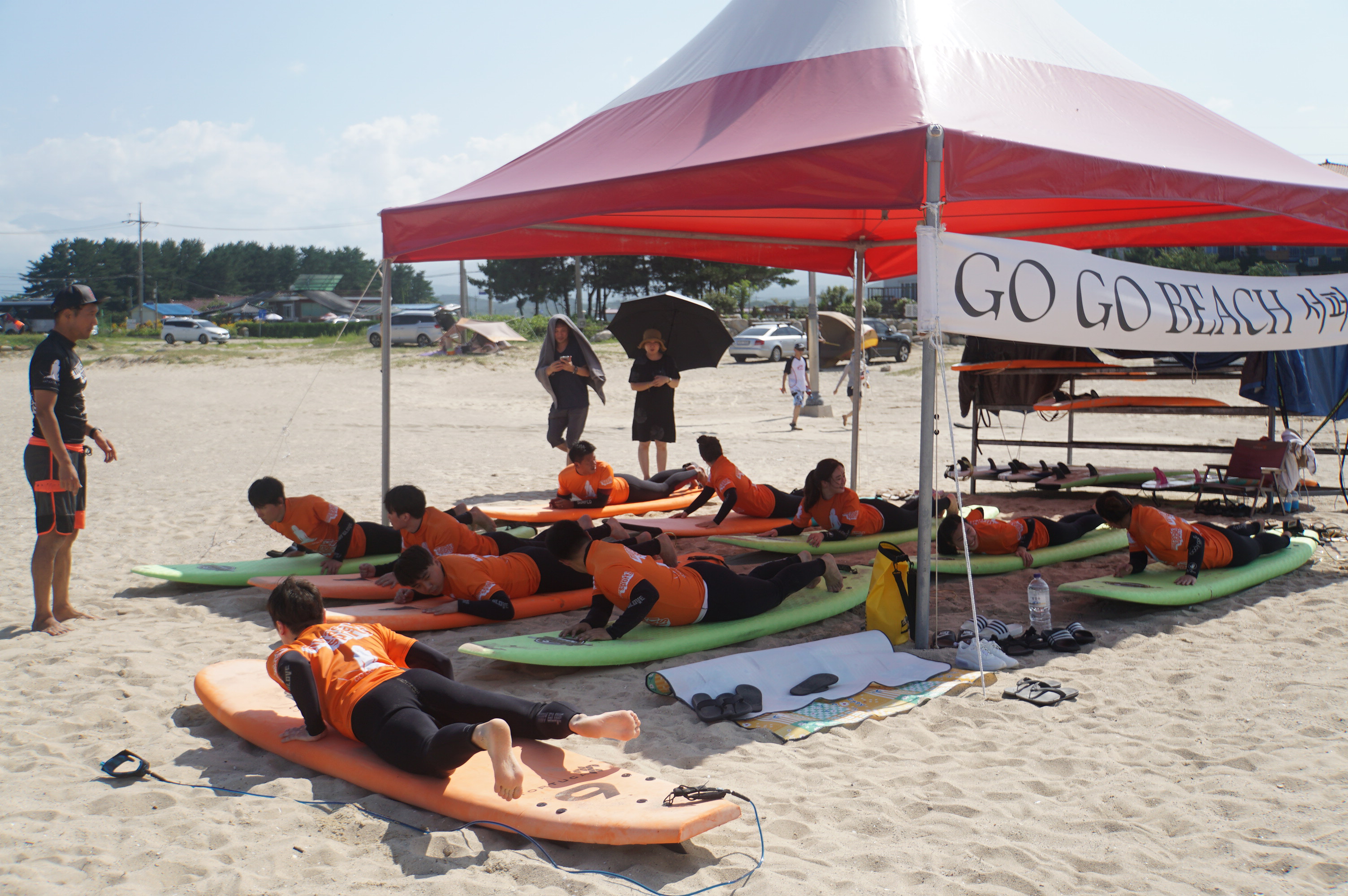 드디어 교습이 시작되었는데요! 서핑에 본격적으로 들어가기에 앞서 실내 이론교육을 먼저 진행했어요. 흔히들 서핑은 새로운 물놀이 중 하나라고 생각하곤 하는데요, 사실 서핑은 단순한 물놀이가 아닌 ‘익스트림 스포츠’이기 때문에 룰교육과 안전교육만으로도 30분 이상 이론을 제대로 배우고 시작해야 한다고 해요. 고고비치 서프 강사님들은 ISA(International Surfing Association) 국제 서핑 코칭 자격을 획득한 전문가로 일반 30분짜리 속성 교육이 아닌 이론+해변+수중 교육까지 2시간 30분을 꽉꽉 채워 강습을 진행해주신답니다.