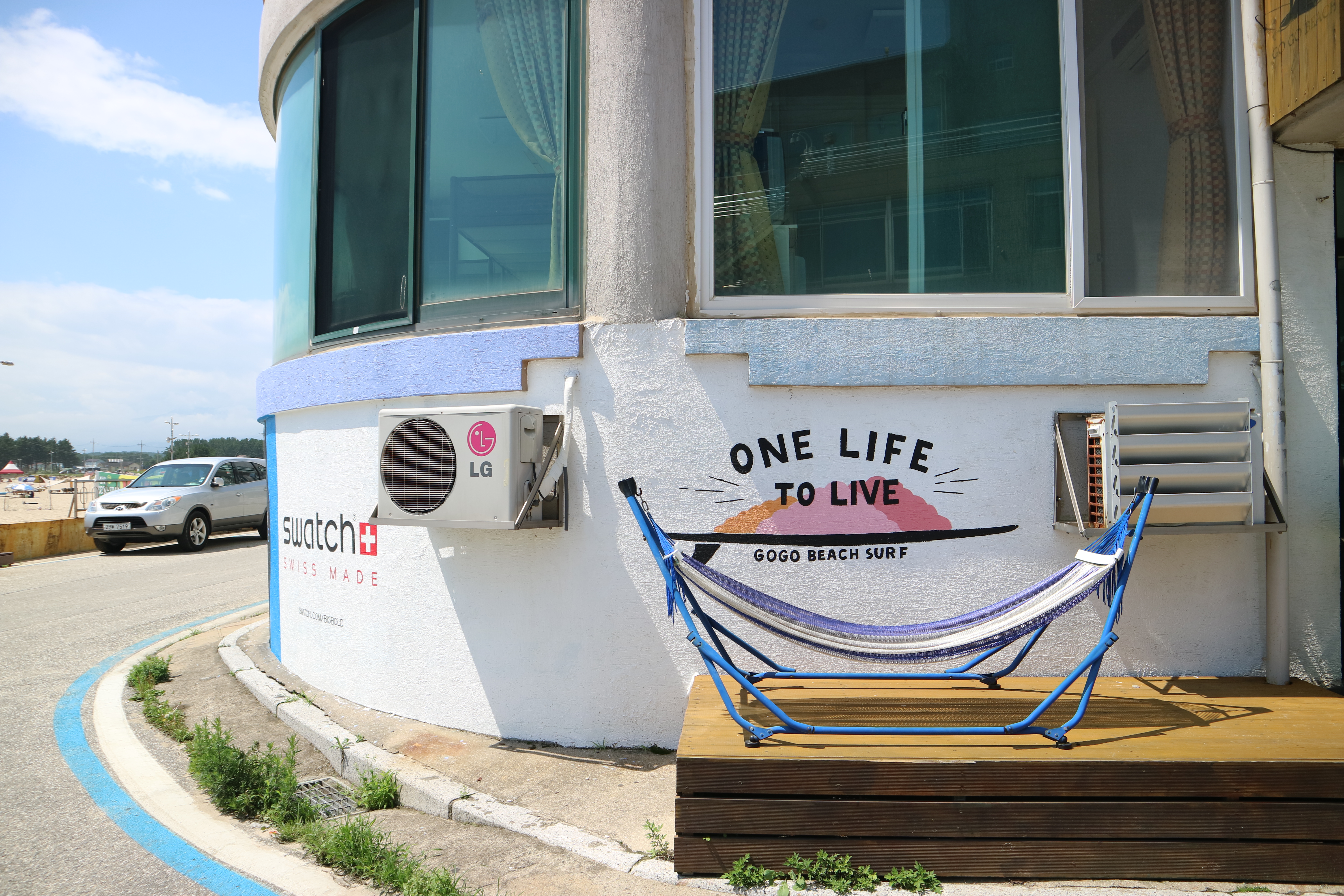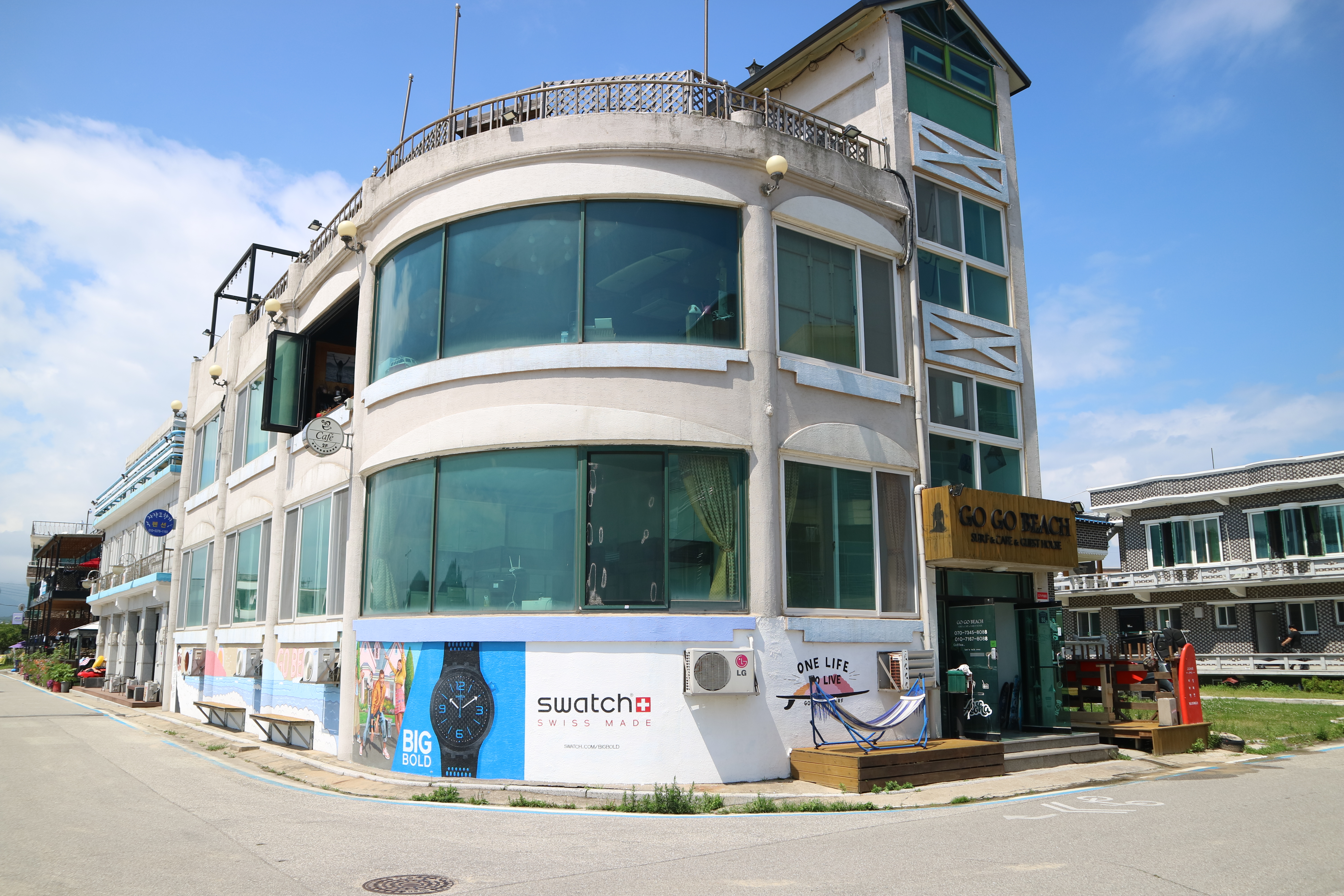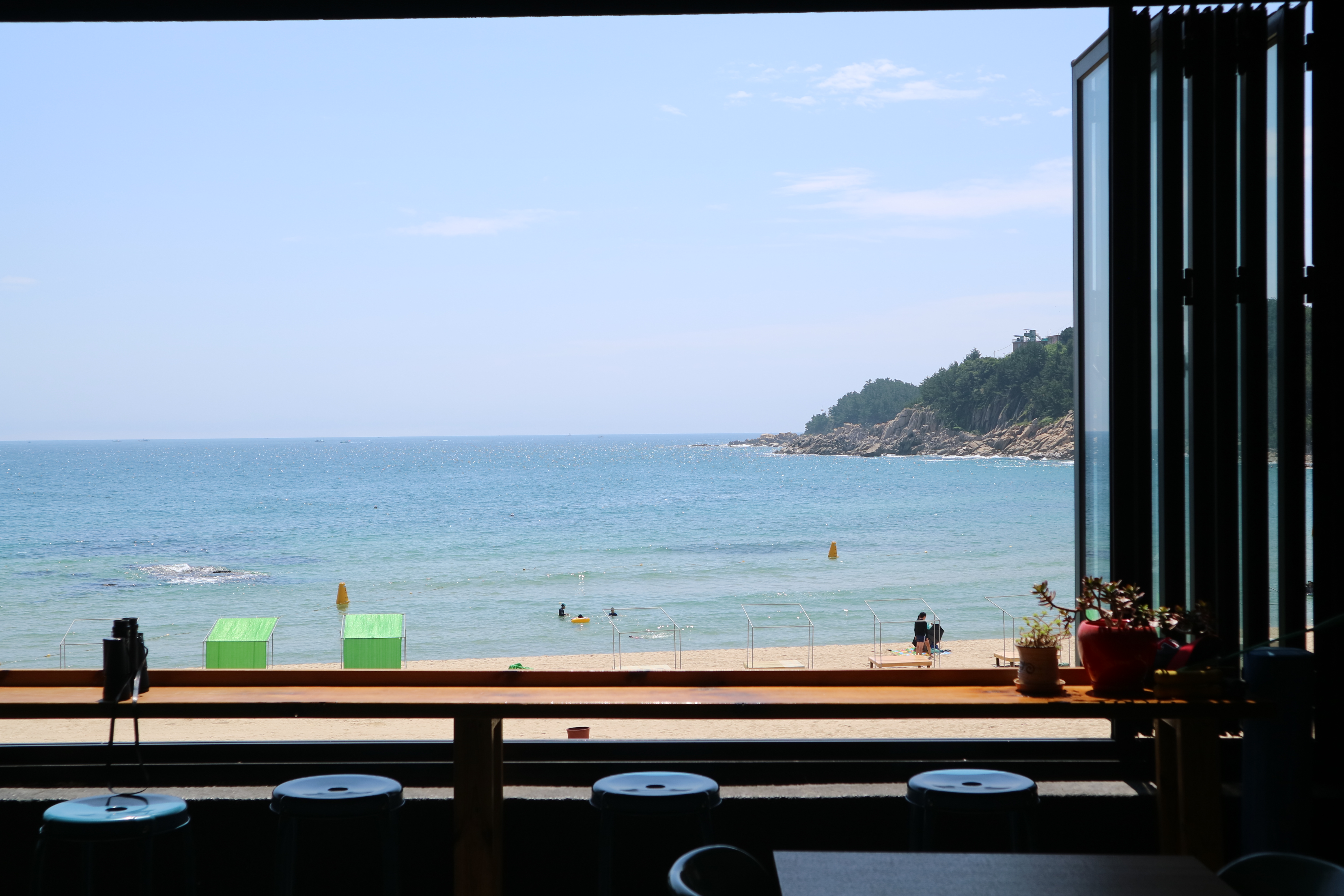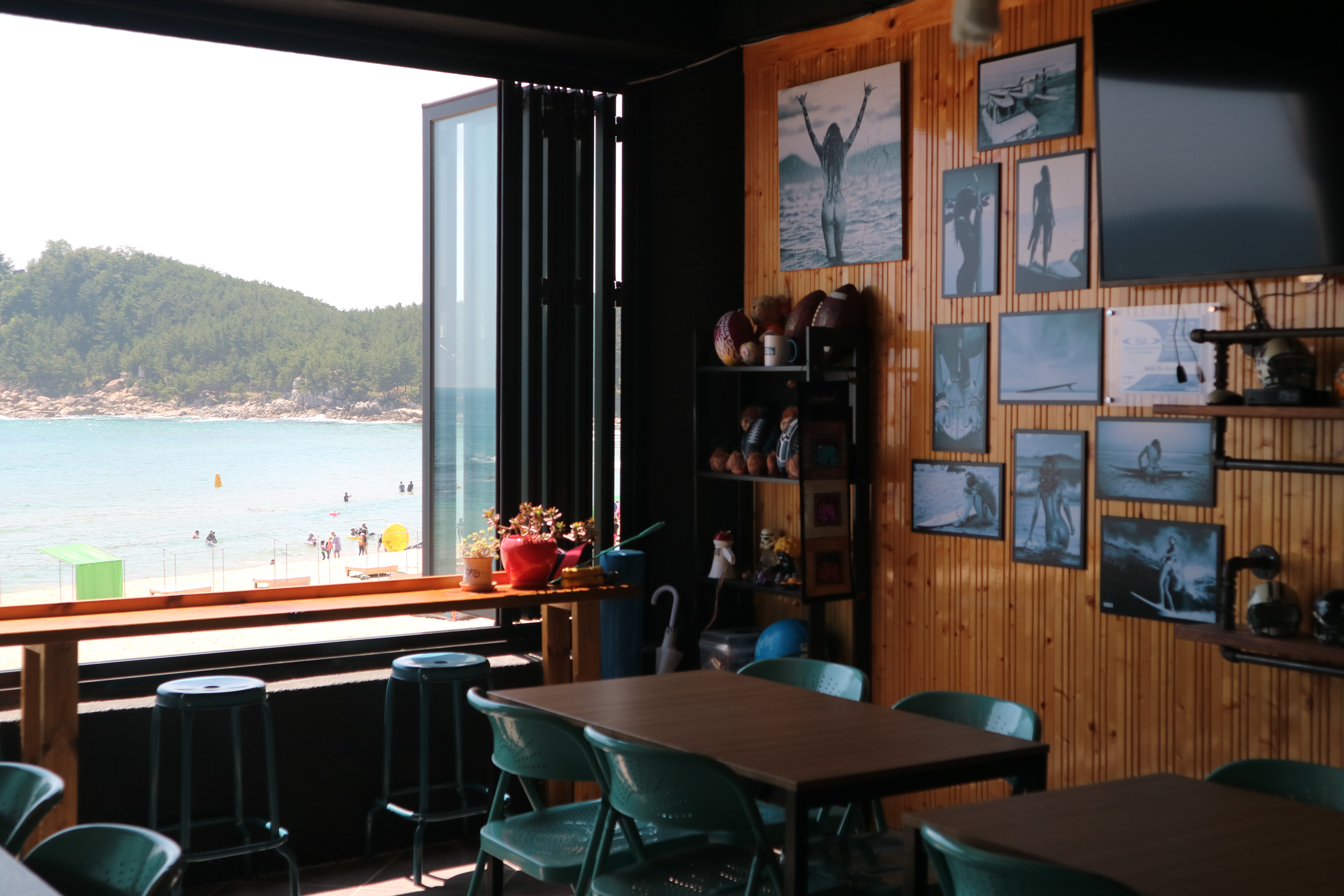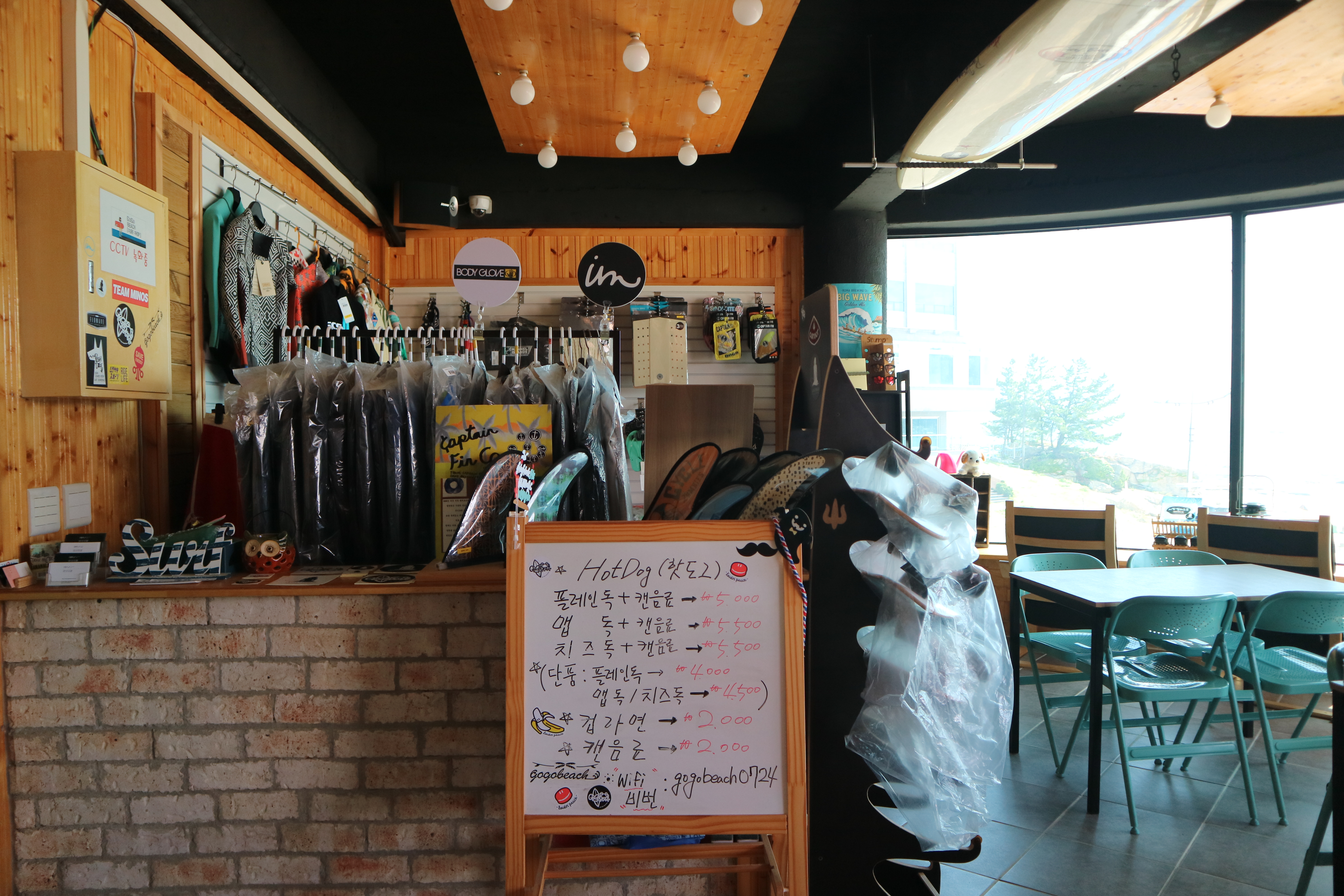 수업 시간보다 여유롭게 도착한 동동이는 잠시 카페에 앉아 휴식을 가졌는데요! 고고비치 서프는 이렇게 카페도 같이 운영하고 있어서 커피와 맥주를 한 잔 즐기며 시원한 자작도 해수욕장을 내려다볼 수 있어요. 시야가 가려지는 부분 없이 시원하게 뚫린 창문은 휴가를 떠난 기분을 제대로 풍겨주죠?