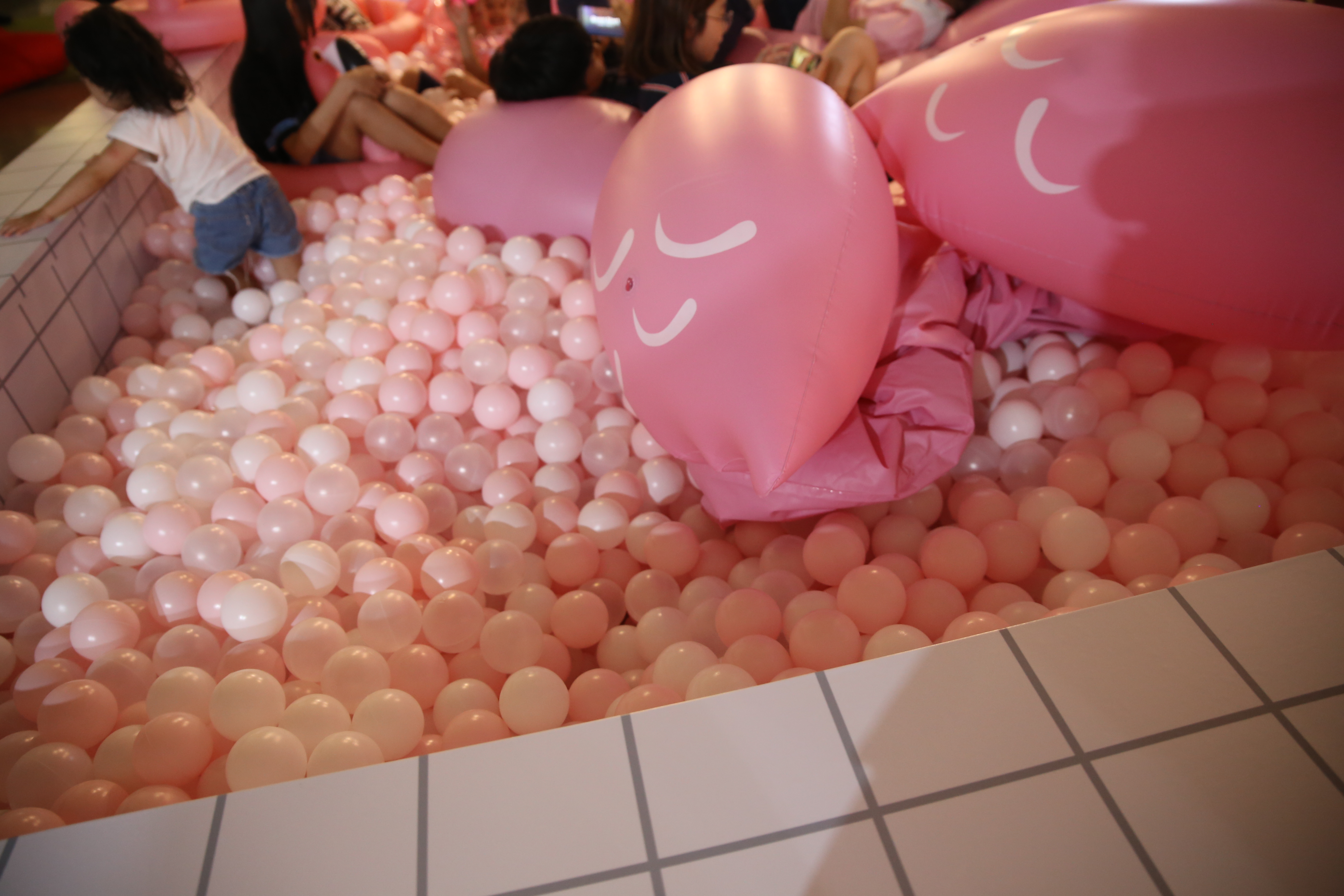 볼풀존 안에는 귀여운 플라밍고 고무인형과 형형색색의 고무공들로 가득해 아이들은 신나게 놀고,어른들은 고무 풍선 위에서 편하게 누워 있는 모습이었습니다