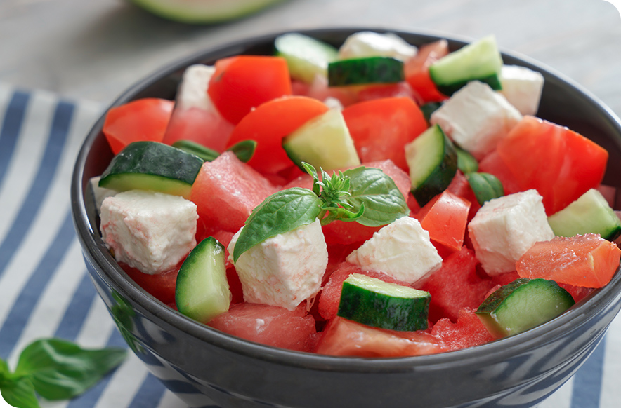 여름 과일의 절정인 수박은 샐러드에 안성맞춤이다. 우선 셀러리를 도톰하게 썰고, 한 입 크기로 썬 수박과 함께 섞는다. 드레싱은 소금, 후추, 올리브 오일, 화이트와인 식초면 된다. 가능하다면 블랙 올리브나 커민 같은 독특한 재료도 곁들여 볼 것. 훨씬 개성 넘치는 맛을 볼 수 있다. 또 다른 방법으로는 멜론, 오이, 수박을 섞고 소금으로 살짝 간을 하는 것이다. 수박셀러리샐러드를 만들 때 사용한 드레싱에 설탕만 살짝 더해 여기에 뿌린다. 무슨 맛이 날까 도저히 상상이 안 된다고? 아마 먹어 보면 여름에 태어난 세 가지 재료가 어우러져 얼마나 신선하고 풍성한 맛을 내는지 깜짝 놀라게 될 것이다. 재료는 감자 필러로 얇고 길게 저며 썬 뒤 섞으면 식감, 맛, 향, 모양이 한결 살아난다.