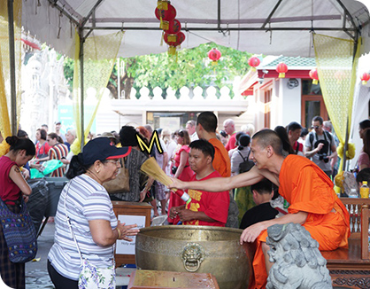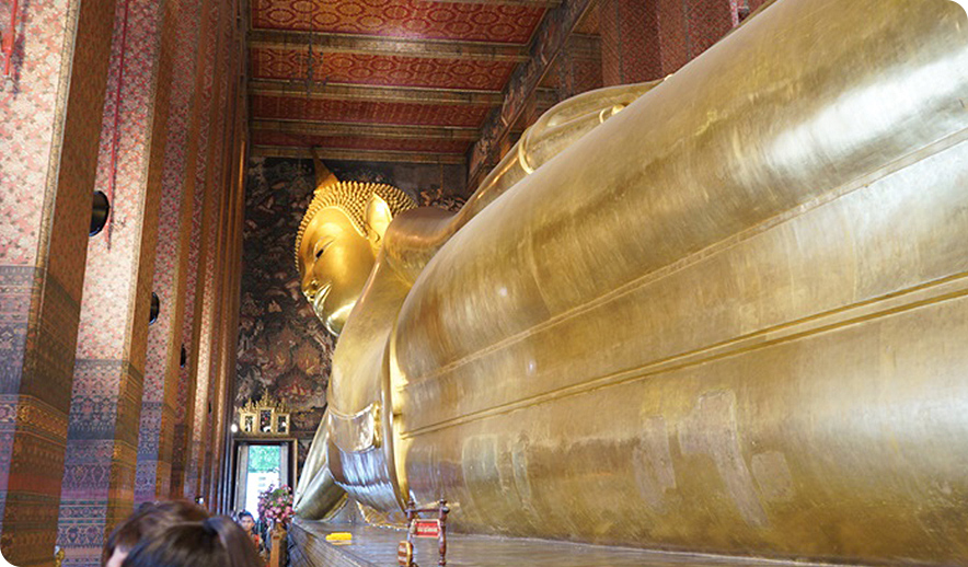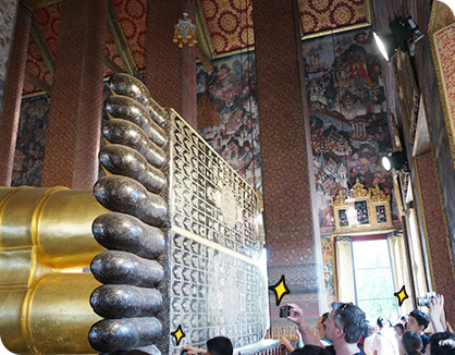 방콕에 왔으니 사원을 둘러보는 것도 빼놓을 수는 없다. 우리가 간 곳은 왓 포 사원으로, 거대한 크기의 와불이 있는 곳으로도 유명하다. 사진만 봐도 그 압도적인 크기가 놀라울 정도다. 실제로 보면 한 눈에 들어오지 않을 정도로 거대하고, 또 거대하다. 와불 옆에는 소원을 비는 항아리가 있다. 태국인들은 이 항아리마다 동전을 떨어뜨려 소원을 빈다고 한다. 운 좋게 사원 광장에서 진행되는 종교의식도 볼 수 있었다.