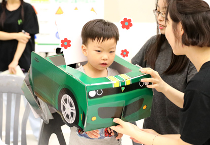 동선의 첫 코스는 바로 DB장학생봉사단 동하리가 운영하는 옐로 카펫 교통 안전교실 부스다. 아이들은 도로표지판과 보행 시 유의점에 대한 설명과 실습 후 하드보드지로 조그만 자동차 코스튬을 작은 손으로 만들었다. 빨간 장갑을 양손에 끼고 자동차로 변신! 초록색 자동차로 변장한 아이들이 도로주행을 하며 선생님의 우회전~ 소리에 오른손을 깜박깜박 흔드는 모습은 어른들의 마음을 귀여움으로 녹여버린다.