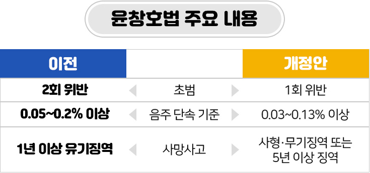 이에 따르면 혈중알코올농도 0.03%(기존 0.05%) 이상일 경우 무조건 민·형사적 책임을 져야 한다. 위반 횟수 1회를 기준으로, 혈중 알코올 농도 0.03~0.08%는 1년 이하의 징역 또는 500만 원 이하의 벌금, 0.08~0.2%는 1년 이상 2년 이하의 징역 또는 500만 원 이상 1,000만 원 이하의 벌금, 0.2% 이상의 만취 상태는 2년 이상 5년 이하의 징역 또는 1,000만 원 이상 2,000만 원 이하의 벌금이 부과된다. 또한 횟수에 따라 10~20%의 보험료가 할증되고, 종합보험에 가입되어 있더라도 대인 사고 시 300만 원, 대물사고 시 100만 원의 자기부담금을 내야 한다. 사람을 다치게 한 경우 1년 이상 15년 이하의 징역, 사망에 이르게 한 사람은 무기 또는 3년 이상의 징역에 처할 수 있다.