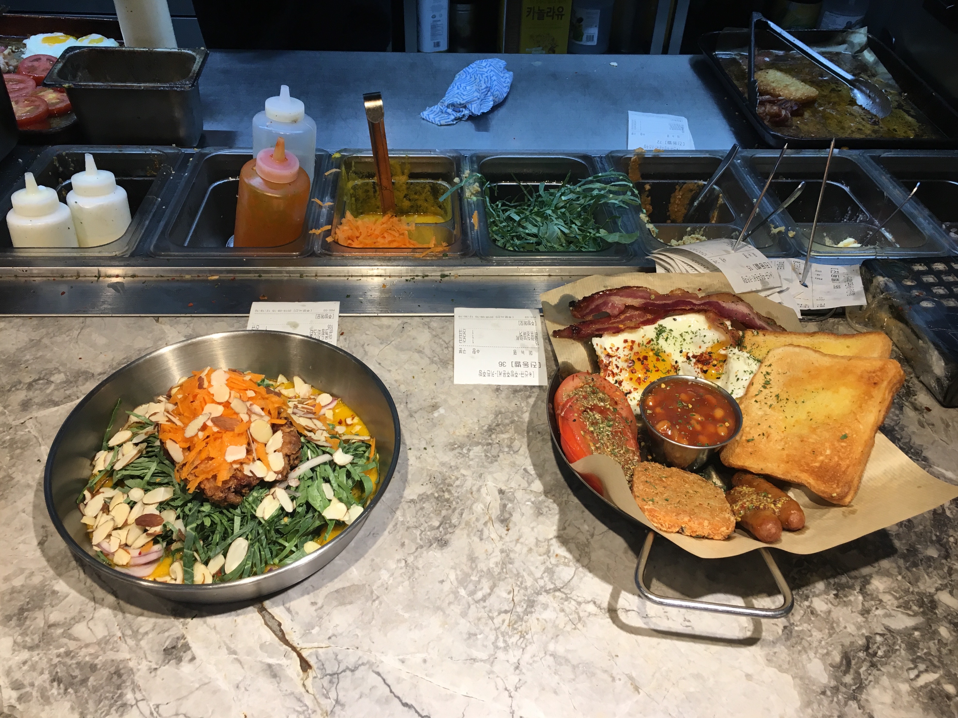 아몬드 치킨 샐러드는 당근 · 생강 · 미소 · 메이플 시럽으로 만든 드레싱이 독특한 케일 치킨 샐러드이고, 포켓 브런치는 두 가지 하머스와 콘 · 오이살사 · 커리소고기볶음을 피타브레드에 넣어 먹는 이색적인 플레이트 브런치로 양이 푸짐해 모든 시간대에 고르게 인기를 얻고 있답니다.