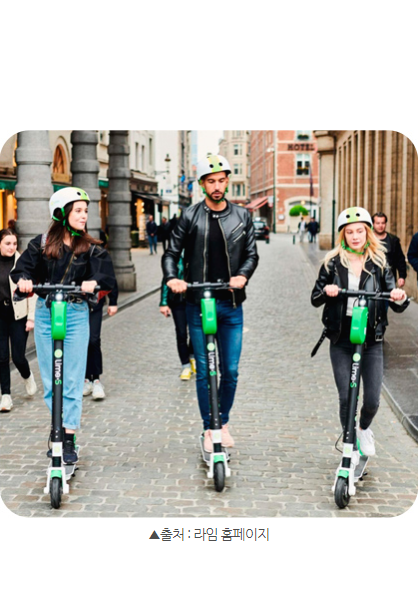 모빌리티 공유 서비스는 꾸준한 성장세와 시장 가치를 바탕으로 국내에서도 두각을 나타내고 있다. 친환경 교통수단인데다 대중교통을 타기에 애매한 거리 이동이나, 꽉 막힌 도로를 피해 서둘러 이동할 수 있다는 장점 덕분에 젊은 층에서 큰 인기를 끌고 있다. 이미 킥고잉, 고고씽 등 20여 개의 국내외 업체들이 각축을 벌이고 있고, 세계 1위 기업인 ‘라임’이 10월부터 한국 시장에 본격 진출하면서 한국은 최근 공유 킥보드 업체들의 각축장으로 거듭났다. ‘라임’은 싱가포르 기업인 빔, 독일 기업인 윈드에 이어 한국 시장에 진출하는 3번째 해외 전동 킥보드 업체다. 차량 공유 업체인 우버가 미국에서 운영 중인 전동 킥보드 공유 브랜드 ‘점프’도 곧 한국 시장에 진출할 것으로 예상된다.