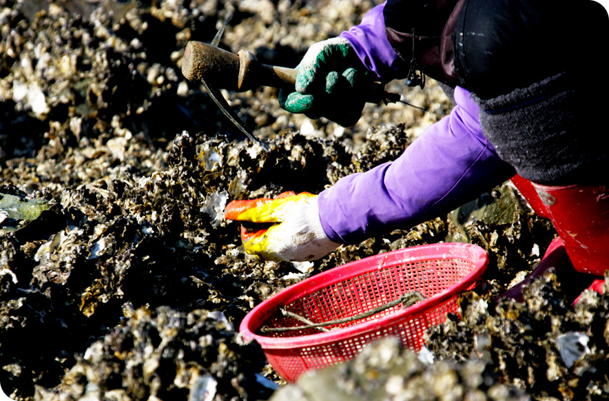 갯벌에서 나는 해산물은 그 수를 헤아릴 수 없을 만큼 많다. 맛도, 영양도 좋지만 그 호사를 누리는데 드는 수고는 만만치 않다. 이를 테면, 갯벌의 조개를 채취하는 방법은 여러 가지인데 우선 널배가 있다. 바닷물이 빠지기 전에 널배(뻘배라고도 불림)에 몸을 싣고 해안으로부터 최소 1km이상 나간다. 널배 위에 한쪽 무릎을 꿇어 몸을 엎드리듯 올리고, 나머지 한쪽 다리가 동력이 되어 차가운 물과 진흙을 밀면서 움직인다.
