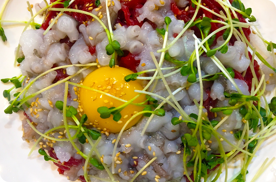 갯벌의 맛에 낙지와 꽃게도 빼놓을 수 없다. ‘뻘낙지’는 무안이 유명하다. 봄 낙지보다 맛이 진하고 깊은 뻘낙지는 가을에 유독 살이 야들야들해 진다. 겨울에 대비하는 보양식으로도 으뜸이다. 오죽하면 ‘낙지는 쓰러진 소도 벌떡일어나게 만든다’는 말이 있을까. 낙지는 바락바락 주무르며 빨판을 손으로 훑어 내리며 씻어 준다. 칼로 도마를 탕탕 내리치며 낙지를 잘게 썰고 참기름을 쓱 뿌리면 그 유명한 ‘낙지 탕탕이’가 된다. 여기에 부드러운 소고기육회까지 곁들이면 그야말로 호화로운 한 접시가 완성된다. 낙지를 뜨거운 밥과 섞어 고추장 양념에 비벼 먹어도 맛있다.