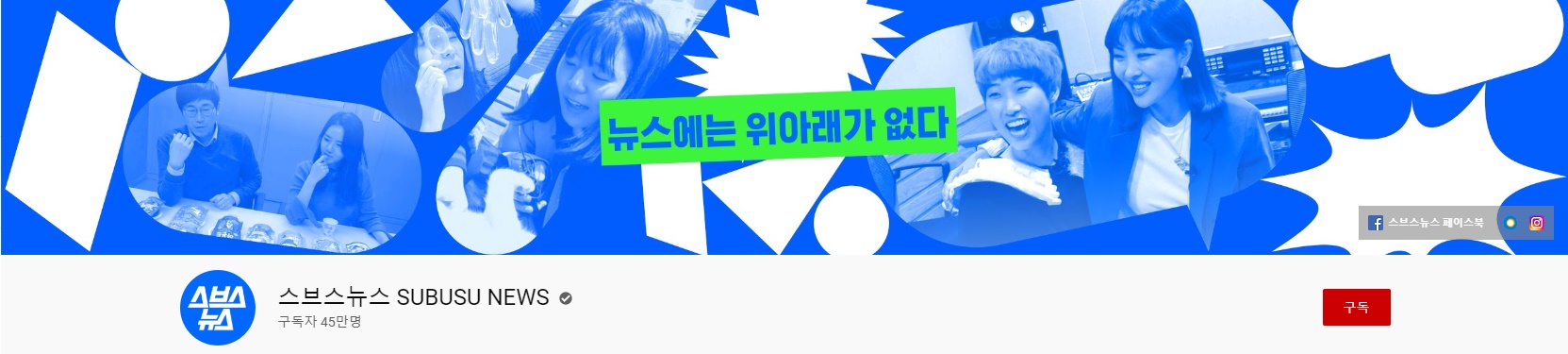 스브스뉴스에서 콘텐츠를 정할 땐 회의를 따로 정해서 하지 않고 ‘이게 진짜 웃기다, 요즘 이게 핫하대’ 하는 것을 서로 공유하며 웃고 떠들면서 자연스럽게 소재를 찾는다고 해요. 그래서인지 스브스뉴스는 요즘 우리가 알고 싶은 것들에 대해 속 시원하게 알려주고 미쳐 알지 못했던 정보들까지 알려주는 신선한 채널로 떠오르고 있어요. 현재 45만 명의 구독자와 약 2천 개의 동영상을 보유하고 있습니다. 뉴스에는 위아래가 없으며 세상의 모든 뉴스를 ‘스브스’답게 전달하고 있는 채널, 한 번 보면 빠져나올 수 없는 뉴스채널입니다.