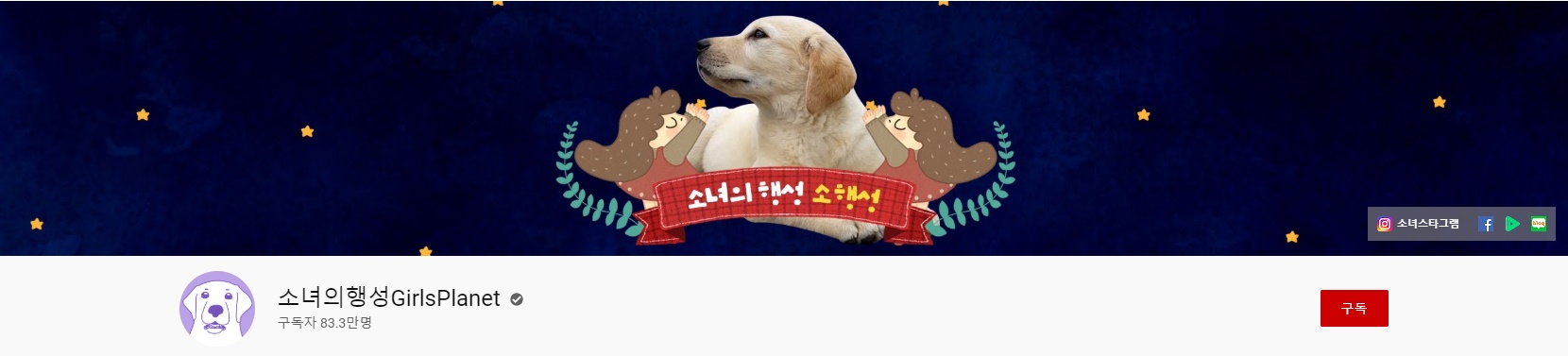 유튜브 랜선 집사인 소녀의 행성은 래브라도 리트리버인 ‘소녀’와 포메라니안인 ‘행성’이라는 두 강아지 이야기입니다. 최근 ‘우주’라는 웰시코기까지 합류해 재미있는 세 마리의 개일상(?)을 보여주고 있어요. 귀여운 댕댕이들을 보기만 해도 힐링 되는 느낌을 받을 수 있어요. 말썽꾸러기에 에너자이저인 세 마리 강아지의 일상을 보고 있으면 피식피식 웃고 있는 모습을 발견하게 될 거에요.