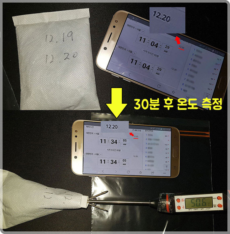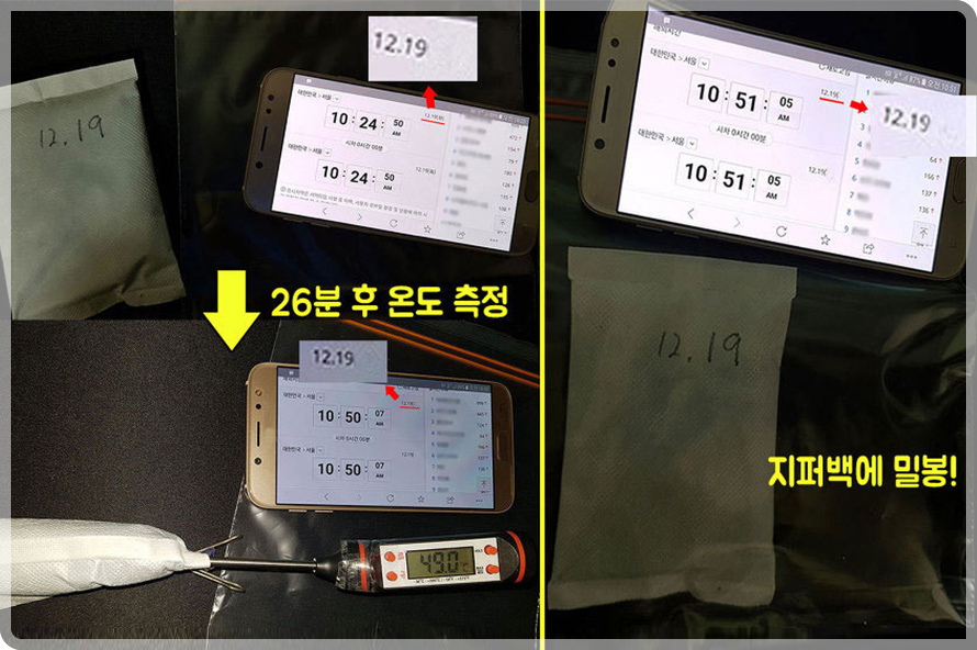 지퍼백 안에 핫팩을 넣고 밀봉하면 산화반응이 멈춘다. 지퍼백에서 핫팩을 꺼내면 핫팩은 멈췄던 산화반응을 지속한다. 믿지 못하는 분들을 위해 직접 실험을 통해 확인해봤다. 핫팩을 개봉한 다음 약 26분 정도를 외부 공기에 노출하고 온도를 측정했다. 온도는 약 50℃였고 이 상태에서 지퍼백 안에 넣은 뒤 24시간 동안 내버려 뒀다. 참고로 핫팩의 중량은 90g이고 최대 사용시간은 15시간으로 안내하고 있다.