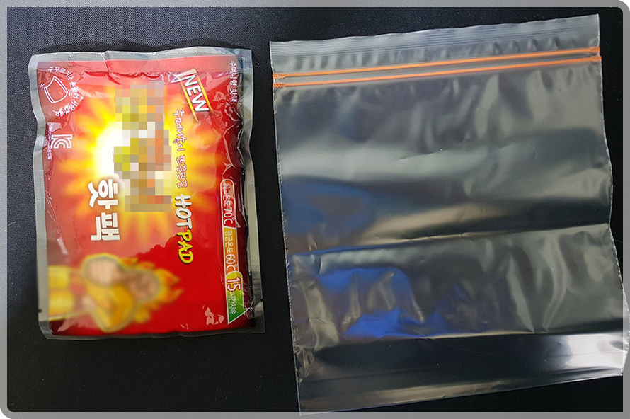 핫팩이 산화반응을 일으키려면 기본적으로 공기와의 접촉이 필요하다. 그렇다면 핫팩을 공기와의 접촉으로부터 차단하면 어떻게 될까? 핫팩의 산화 반응은 멈출 것이고 열을 발산하지 않을 것이다. 이러한 상태를 만들기 위해 우리에게 필요한 준비물은 ‘지퍼백’이다. 지퍼백은 보통 먹다 남긴 식품을 밀봉할 때 사용하지만 핫팩을 사용하지 않을 때도 활용할 수 있다.