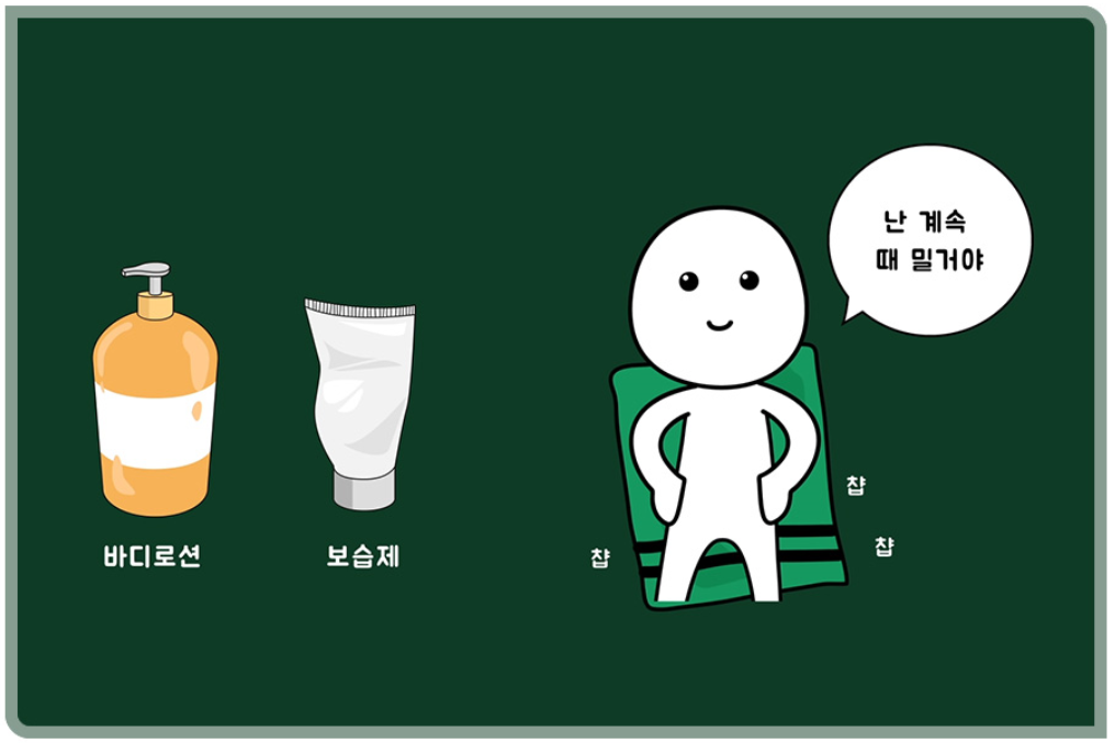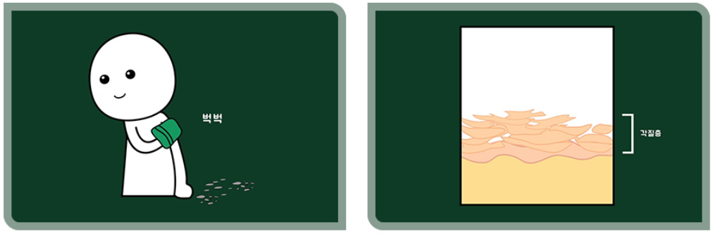 이 순환이 반복되면 피부 세포는 영양분을 공급해주던 모세혈관과 멀어지게 됩니다. 영양분을 공급받지 못한 피부 세포는 죽게 되고 죽은 상태에서 계속 밀려나면 피부에서 떨어져 나가게 됩니다. 우리가 때를 밀었을 때 나오는 물질의 정체가 바로 죽은 피부 세포들로 ‘각질’이라고 이해하면 쉽습니다. 적당한 각질 제거는 피부 건강에 도움이 될지도 모릅니다. 하지만 많은 사람들이 때가 나오지 않을 때까지 때를 밉니다.