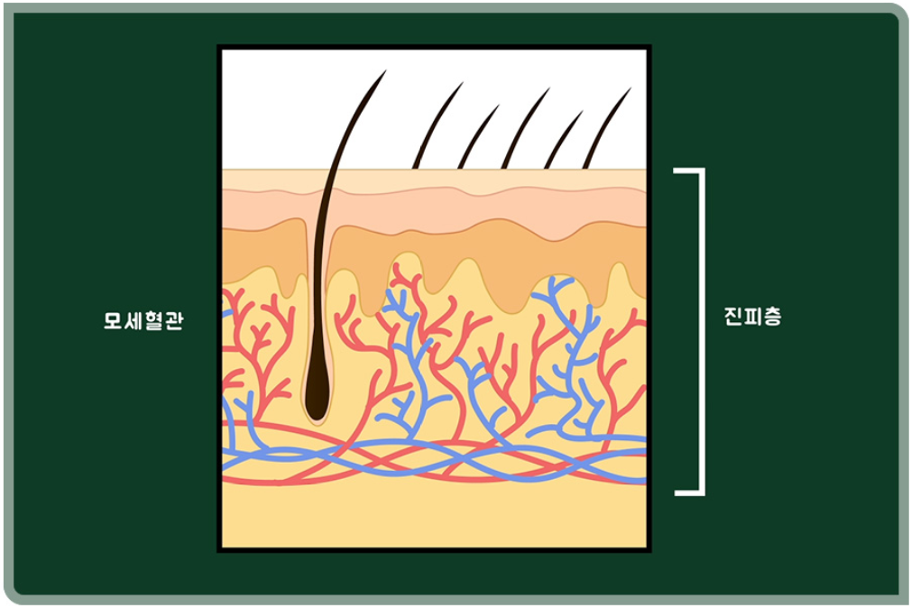 피부는 우리 몸의 표면을 덮고 있는 기관으로 표피층, 진피층, 피하지방층으로 구성되어 있습니다. 진피층에는 피부 세포에 영양분을 공급하는 모세혈관이 있죠. 진피층 아래쪽에서는 새로운 피부 세포가 계속 만들어집니다. 새 피부 세포가 만들어지면 기존의 진피층은 세포 바깥쪽으로 밀려납니다.