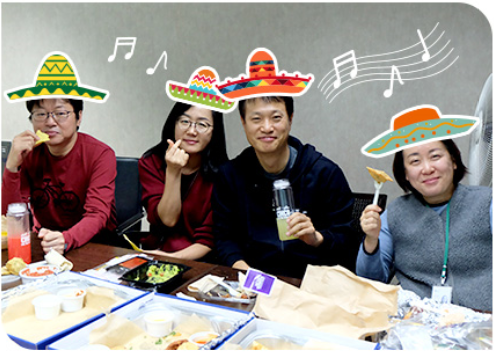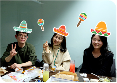 메뉴는 점심 회식인 만큼 간편하고 든든하게 배를 채울 수 있는 멕시코 요리로 결정했다. 열정적으로 회의를 마친 멤버들 앞에 맛있는 음식들이 펼쳐졌다. 이들은 담소를 나누며 음식을 즐겼다. 나이도, 직급도, 하는 일도 모두 다르지만 오랜 친구같이 편안해 보였다. 선지현 차장은 이바구 활동 덕분에 연구소에 더 많은 애정이 생겼단다. “오며 가며 인사 정도만 하던 다른 파트 분들과 친해지게 돼서 좋아요. 김희선 차장님이 좋은 툴(Tool)도 알려주셔서 업무적으로도 나아진 게 많고요. 말랑말랑한 연구소가 되어가는 걸 몸소 느껴요. 앞으로도 이런 분위기가 계속 이어졌으면 좋겠어요.”