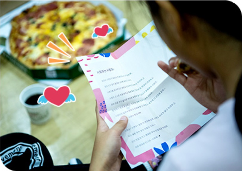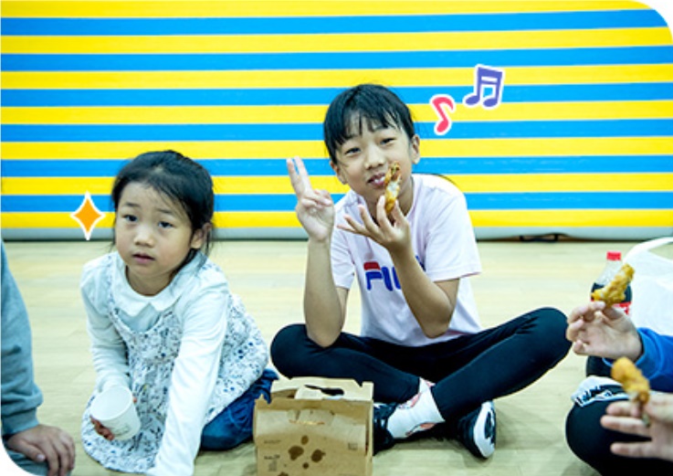 금강산도 식후경, 한 시간 내내 신나게 뛰어놀았으니 배를 좀 채워야 할 때다. 아이들 앞에 갓 구운 피자와 따끈따끈한 치킨이 펼쳐졌다. 고소하고 달콤한 냄새가 식욕을 당긴다. “시영아, 수연아 고마워! 맛있게 잘 먹을게!” 그렇게 뛰어다니고도 지치지 않는지 학원 친구들은 쩌렁쩌렁한 목소리로 고마운 마음을 전했다.