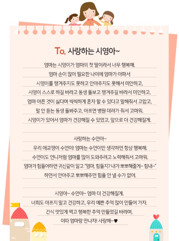 “제 소원은 엄마가 아프지 않는 거예요. 그리고 언젠가 하와이에 같이 가고 싶어요. TV에서 봤는데 하늘이랑 바다가 진짜 멋있었거든요. 엄마가 빨리 건강해져서 같이 여행도 많이 다녔으면 좋겠어요. 엄마~ 우리가 많이 사랑해~ 아프지 말고 오래오래 건강해야 돼!”