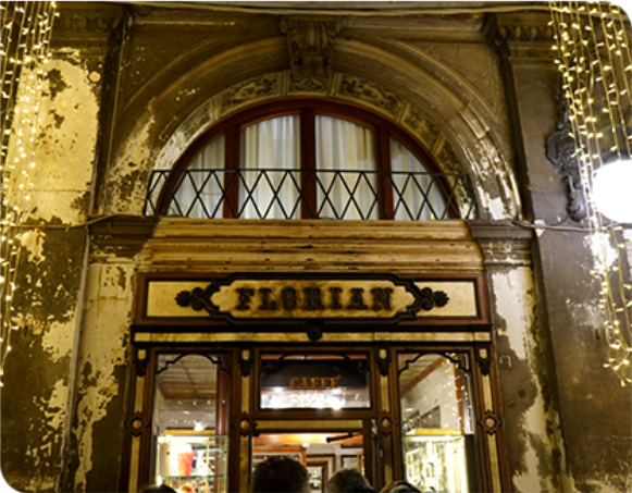 올해로 300년을 맞은 카페 플로리안(Caffe Florian)은 이탈리아에서 가장 오래된 카페다. 산마르코 광장에 위치해 있는데 낡은 외관을 그대로 두어 더욱 멋스럽다. 시인 괴테와 세기의 바람둥이인 카사노바도 사랑한 카페라고 한다. 핫초코가 유명하다고 해서 시켜 보았는데 적당한 달콤함에 고급스러운 플레이팅까지 맛도 분위기도 만점이었다.