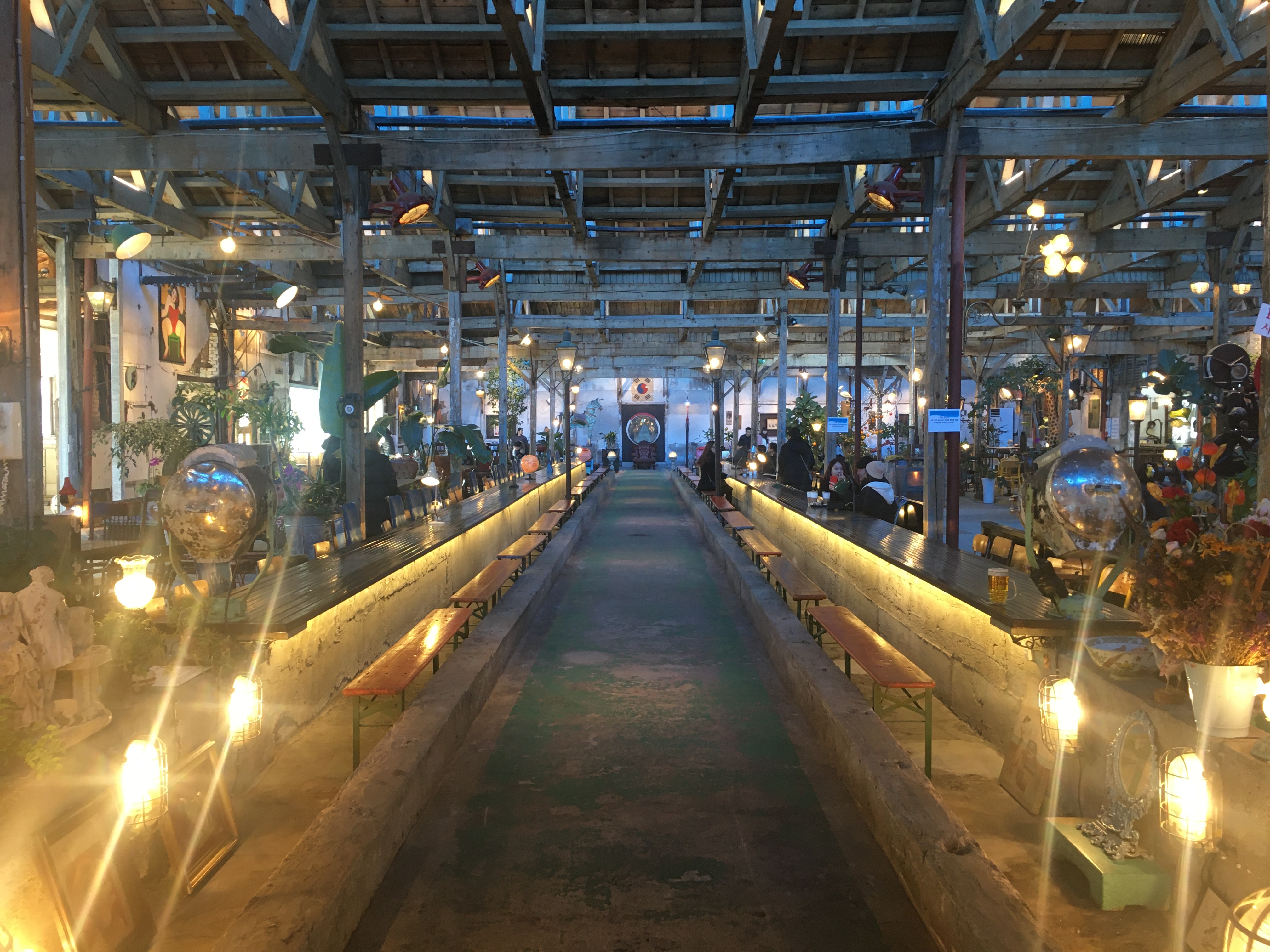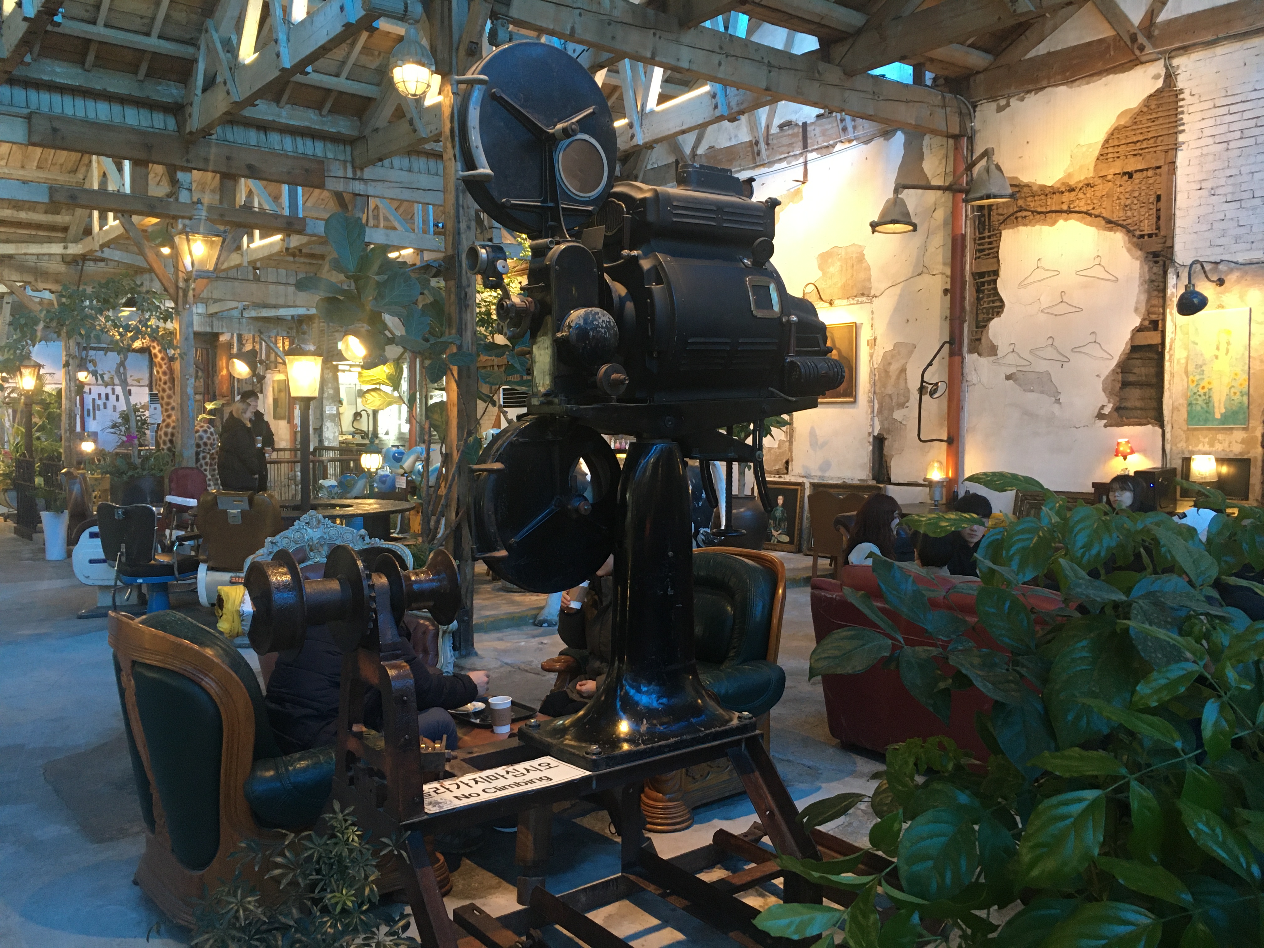 널찍한 카페 공간 구석구석에는 크고 작은 전시품이 많아 보는 재미도 있어요. 일제강점기에 사용했던 태극기와 영사기, 1980~90년대 영화에서나 볼 법한 빨간 공중전화박스, 놀이공원에서 탈출한 듯한 목마 모형, 한때 꽤나 사용했을 법한 재봉틀도 있어요.