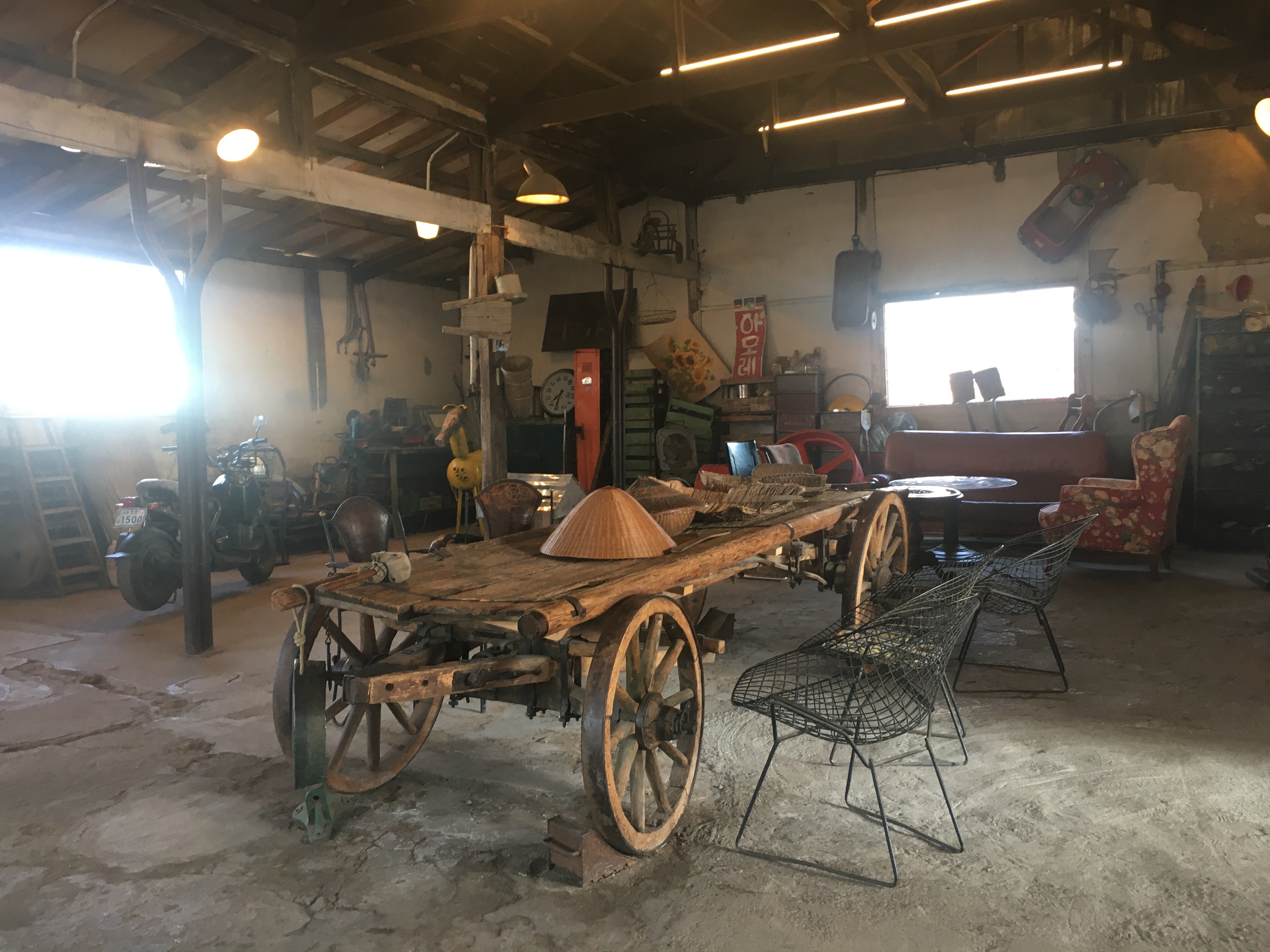 널찍한 카페 공간 구석구석에는 크고 작은 전시품이 많아 보는 재미도 있어요. 일제강점기에 사용했던 태극기와 영사기, 1980~90년대 영화에서나 볼 법한 빨간 공중전화박스, 놀이공원에서 탈출한 듯한 목마 모형, 한때 꽤나 사용했을 법한 재봉틀도 있어요.