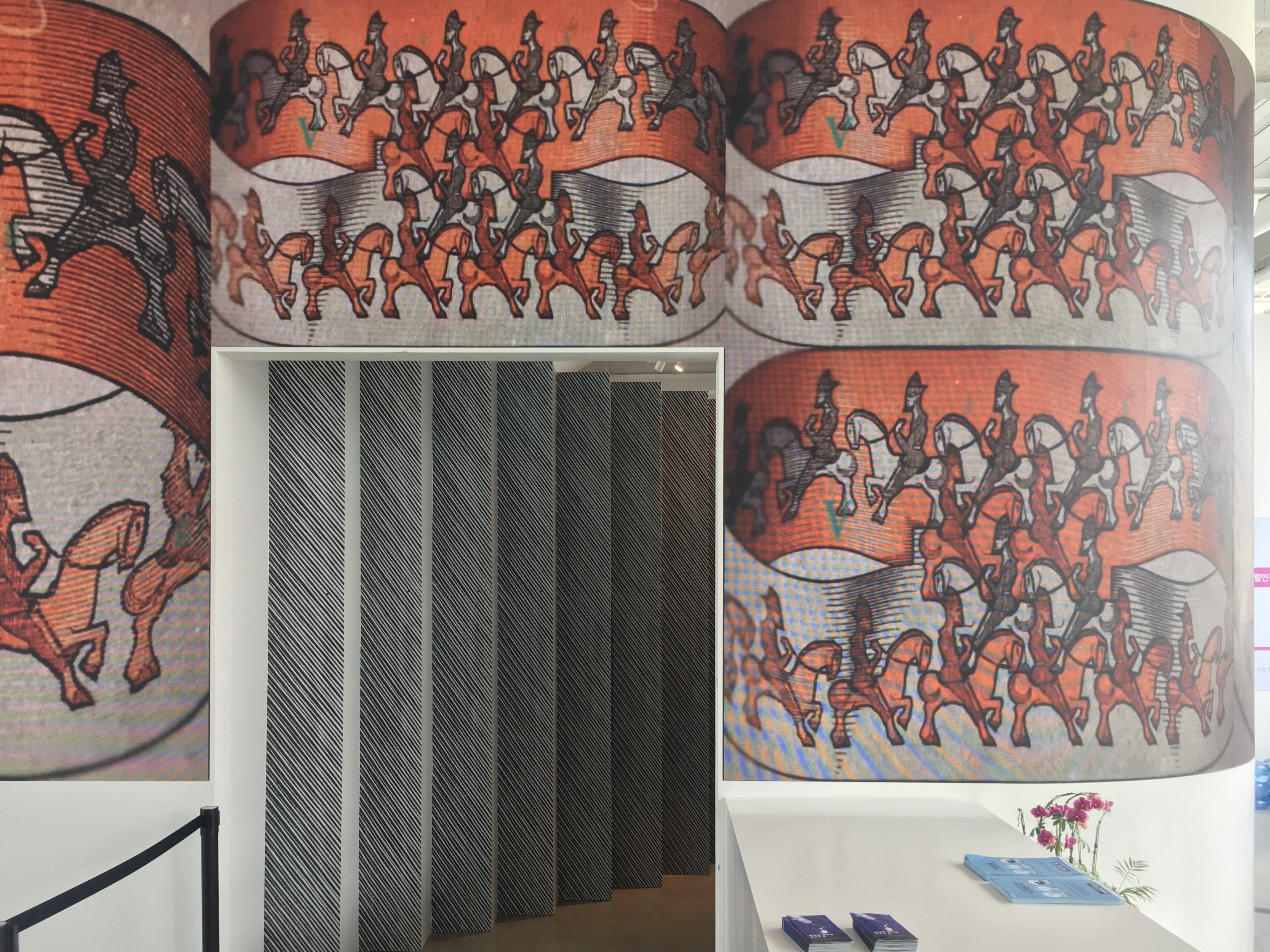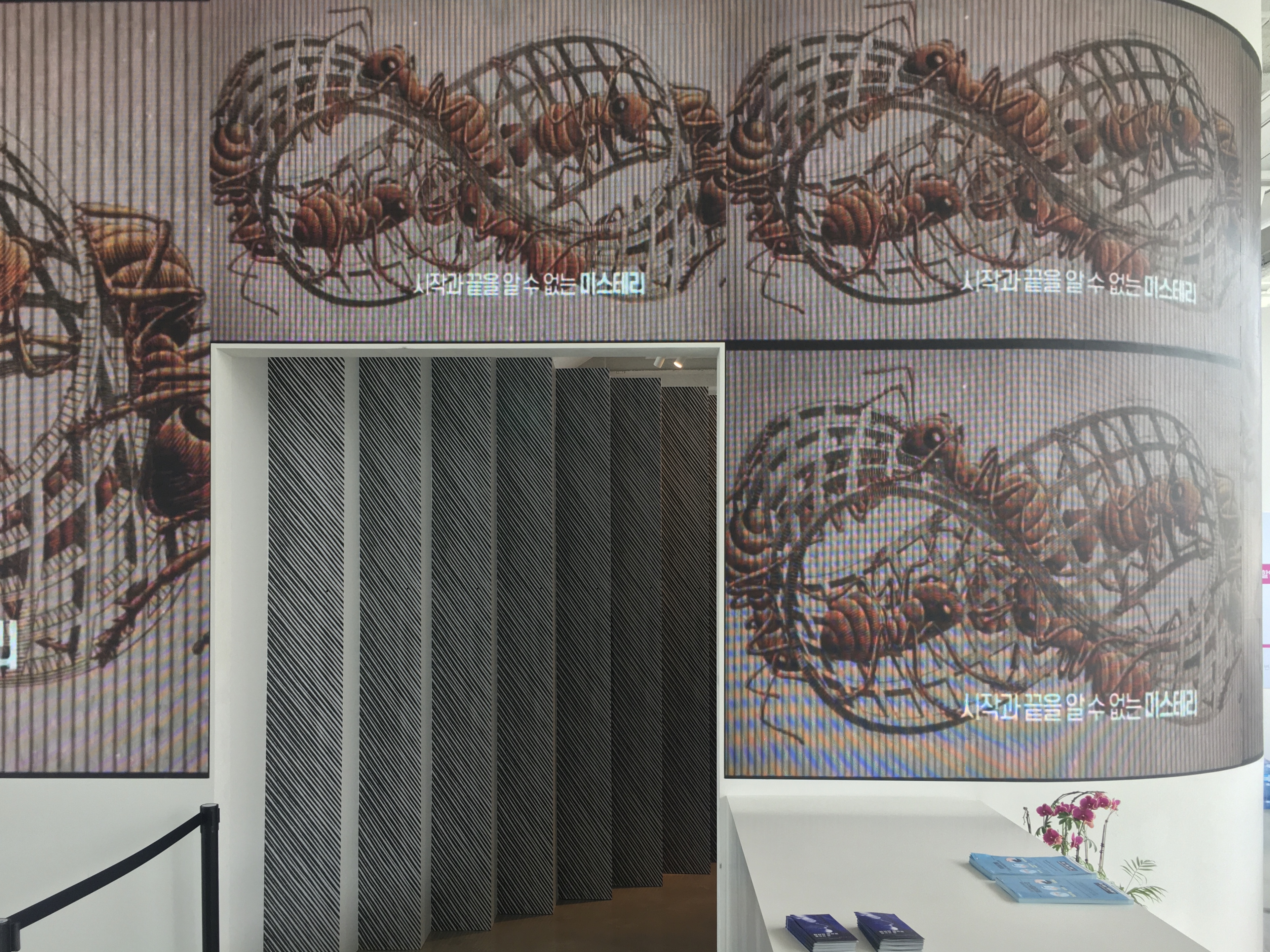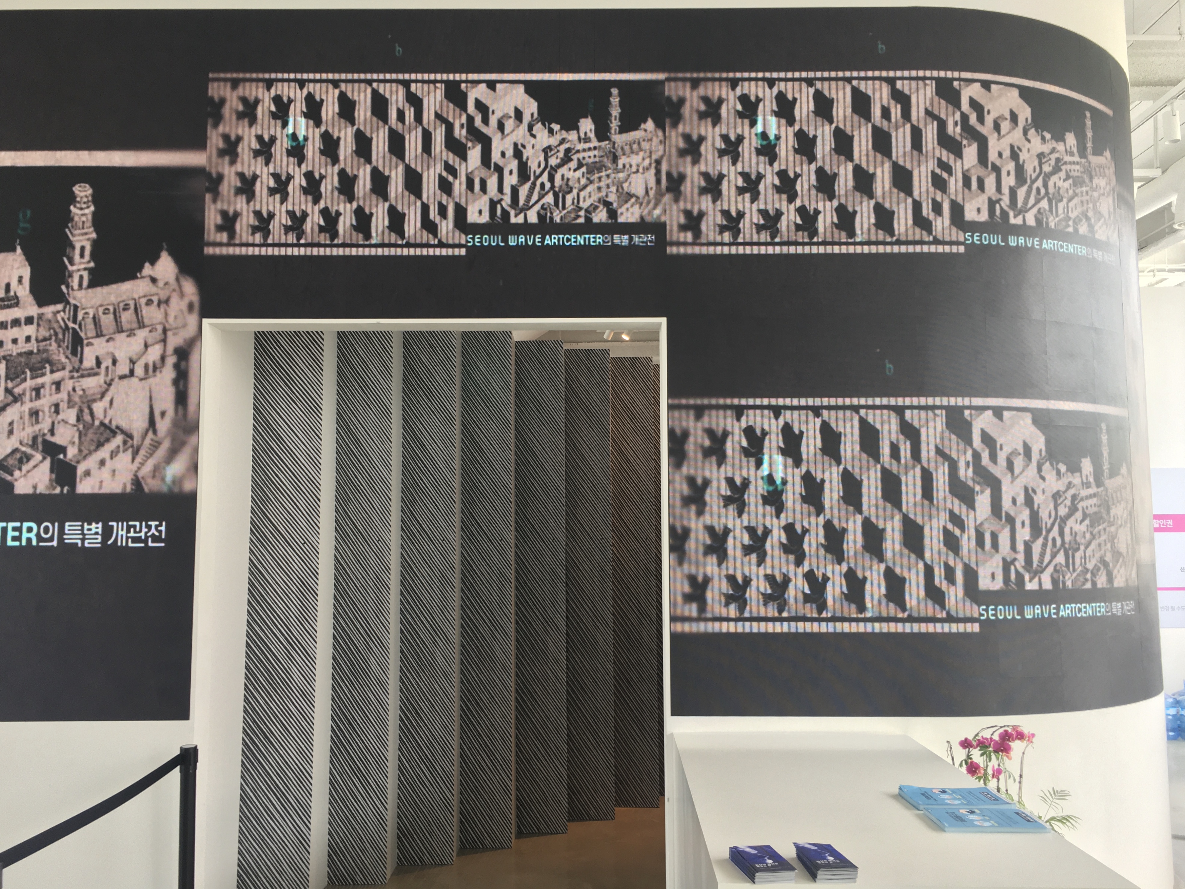 전시장 입구에는 대형 디지털 사이니지가 설치되어 있어서 에셔의 작품들을 보여주고 있는데요. 잠시 멈춰 서서 디지털로 표현한 에셔의 작품을 미리 감상하는 것도 좋을 것 같아요. 이제 에셔가 스케치한 것처럼 만든 전시장 입구를 통해 ‘에셔의 방’으로 들어가 볼까요?